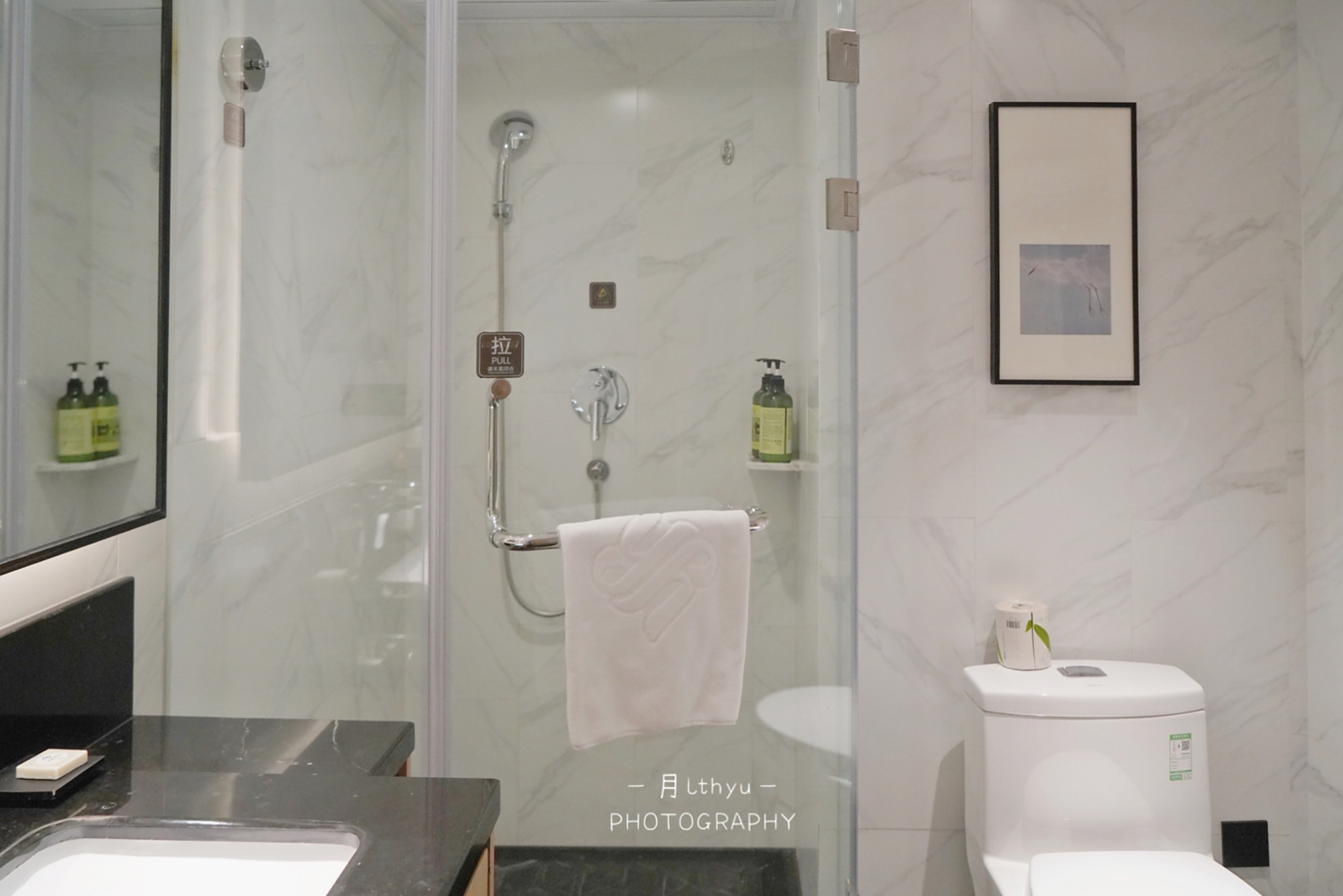 浴室内干湿分离,除了必备的洗浴用品,这里还有洗手液、润肤露。超喜欢这里的洗发水,香味超好闻。