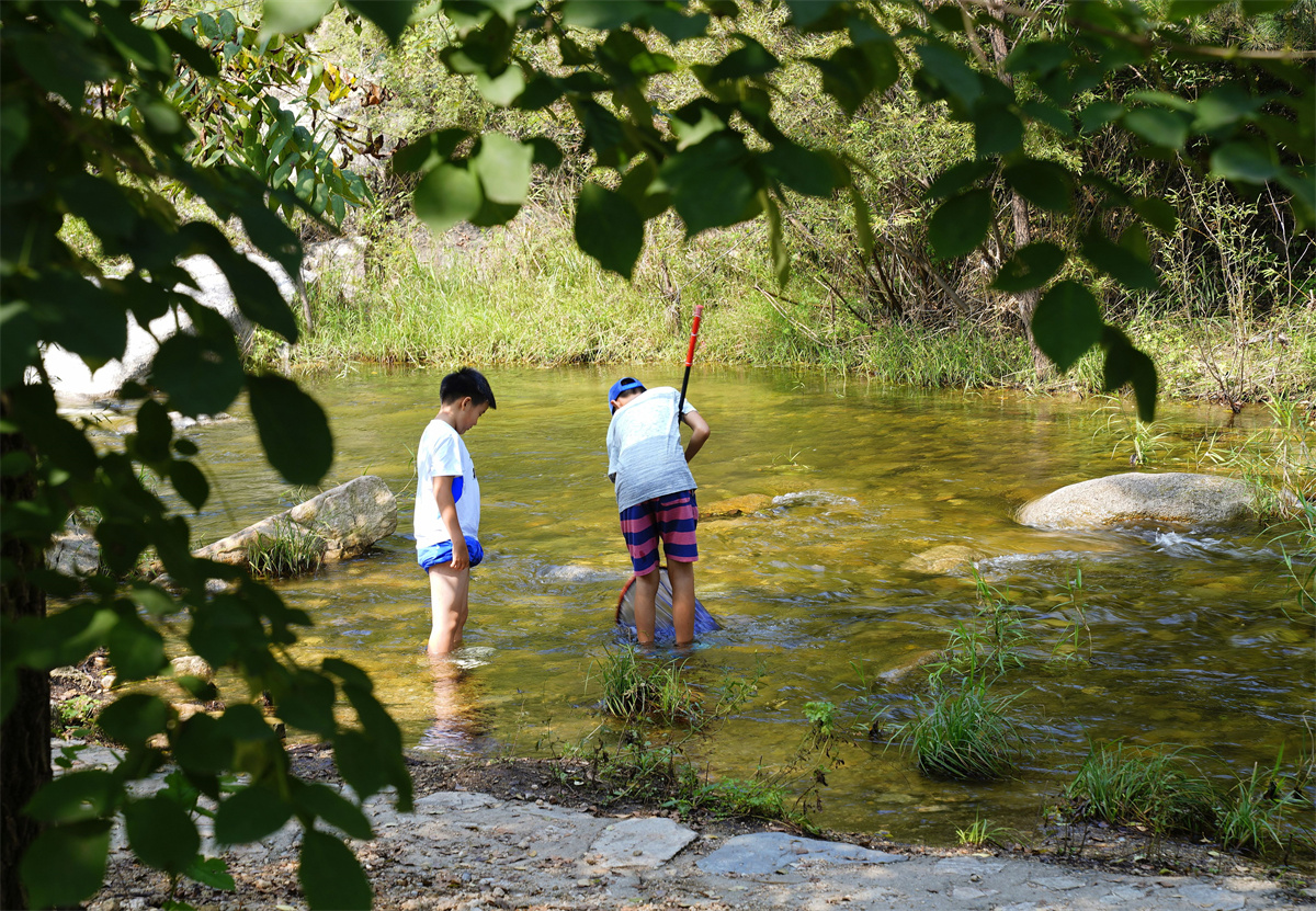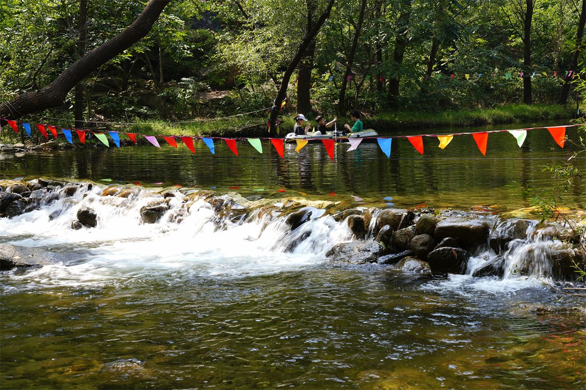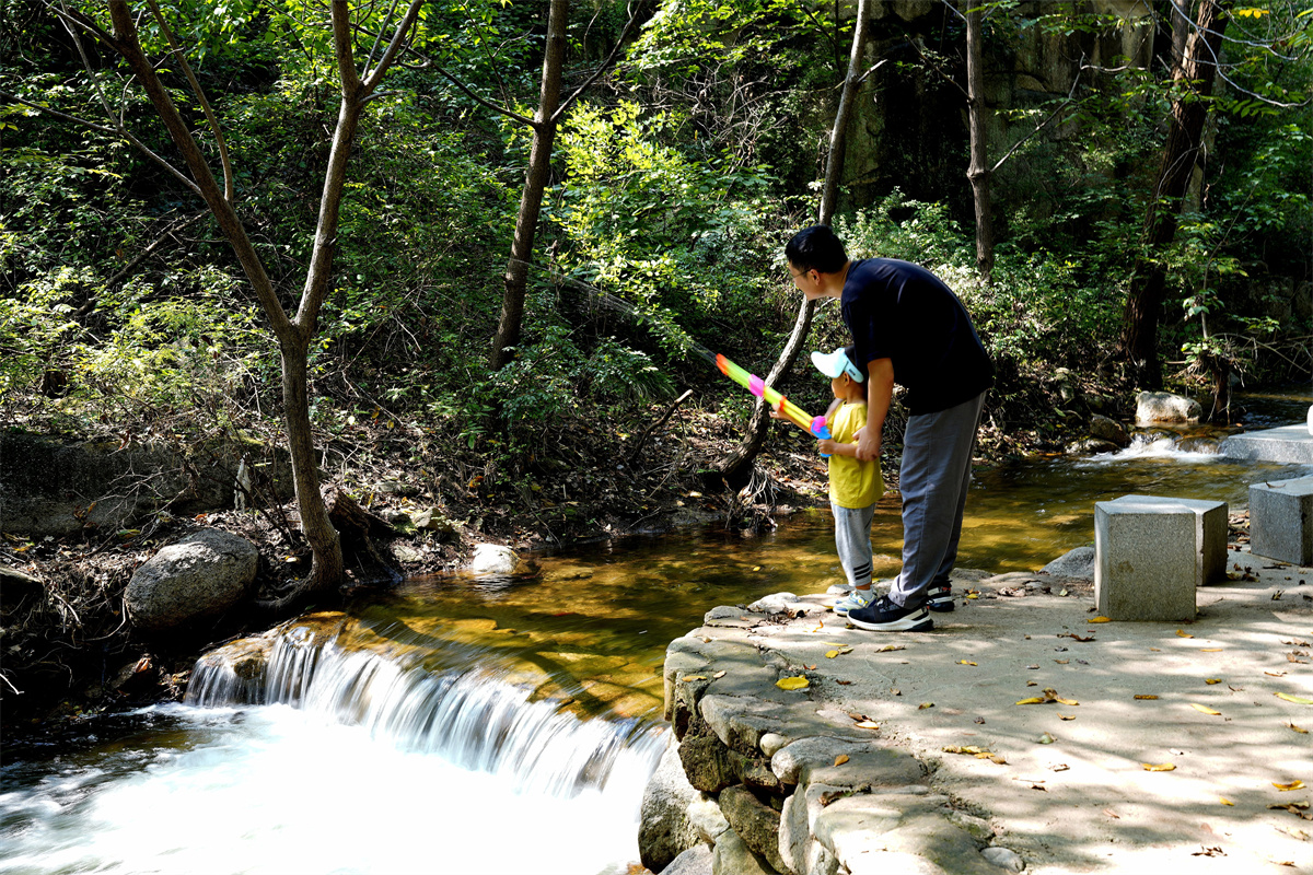 走进距京城65公里的怀柔区神堂峪自然风景区,发现这里不少老人、孩子出游的身影,人们开心遛娃,轻松行走在山水之间,一副其乐融融的景象。