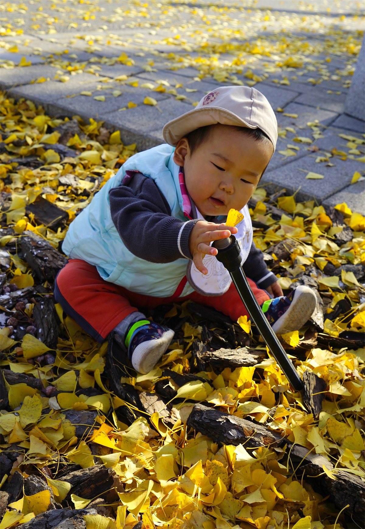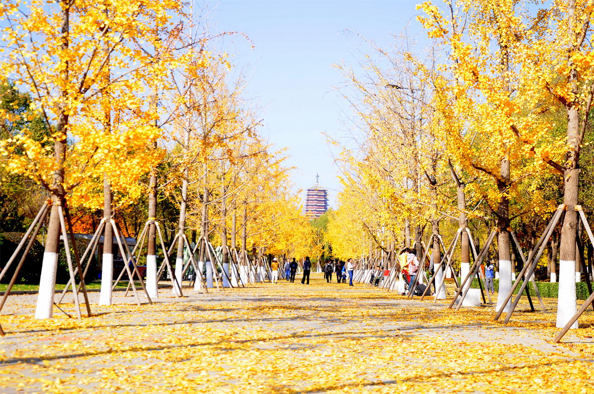 园博园的银杏大道是赏秋的一条主线,从三号门进入园区,沿着主线一路向北,虽说道路两旁的银杏树枝干并不粗壮,但是随风飘舞以及铺在脚下的金黄色叶子,让游人流连忘返。人们徘徊在树丛中,凝视着明黄亮丽的银杏大道,凝视着远方隐约可见的永定塔,用心地记录下京城晚秋的绚丽多彩。