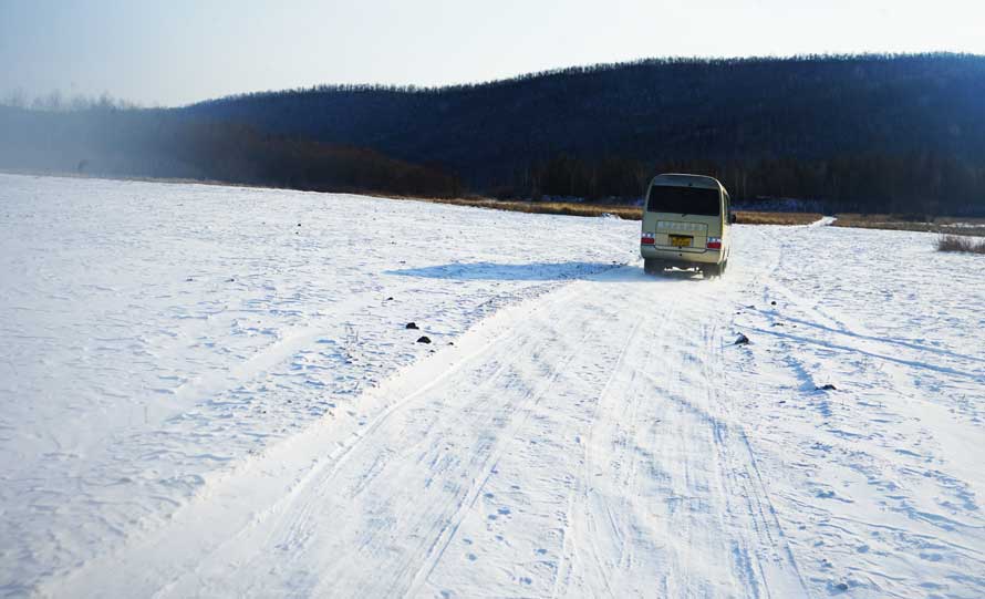 第二天,朋友带我去看了“十里画廊”。出城区向南,过兴安大桥和加格达奇体育馆,然后就是茫茫雪原,沿着仅能并排行驶两辆车的道路行进了大约一个多小时的样子,车子向右拐进了一条小道,四野苍茫,雪白一片,视线之内没有一座建筑,貌似在视线最远处,有一片林木,除此之外什么都没有了。在小道上缓慢行驶大概5-6分钟,朋友说,距离十里画廊还有2公里左右,咱们得下车步行,雪太厚车子走不动。