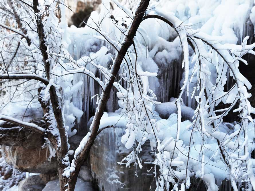 沿河流张望,那冰雪羽衣绵延数里,形成巧夺天工的雾凇和冰挂,的确美不胜收,各种造型的冰挂晶莹剔透,珍宝般悬挂于草尖、枝丫;结冰的河水和流动的河水相互依偎蜿蜒,在洁白的雪原上勾勒出界限分名的线条,自然而灵动。