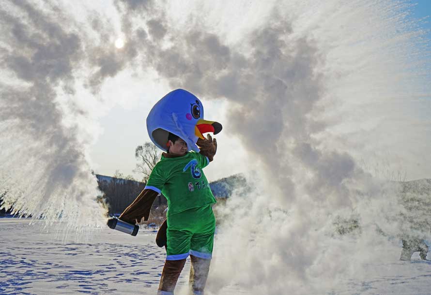 朋友说,滴水成冰让你见识下。说着他送背包里拿出了一个暖水壶。只见他拔掉瓶塞,然后喊道一二三,随着他将水壶用力向上泼去的力道,一条巨大的白色水雾顷刻间将他笼罩,随之落下来的竟然是一片冰碴。他说,这样玩丝毫不用担心热水会烫着自己,因为热水在出来的一瞬间就被雾化成冰雪了……的确,极寒的天气里,开水会瞬间结冰。