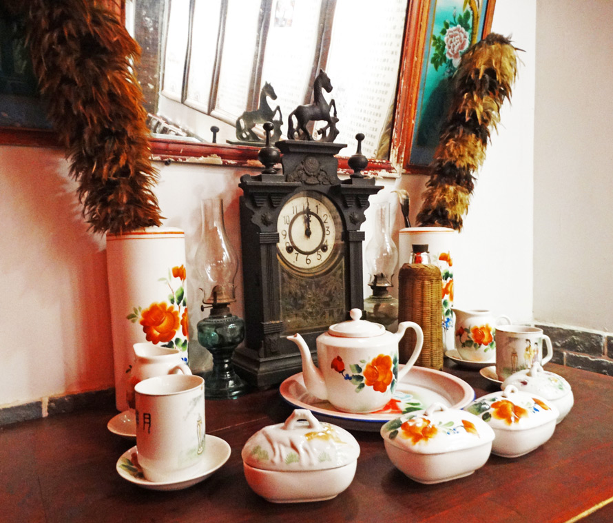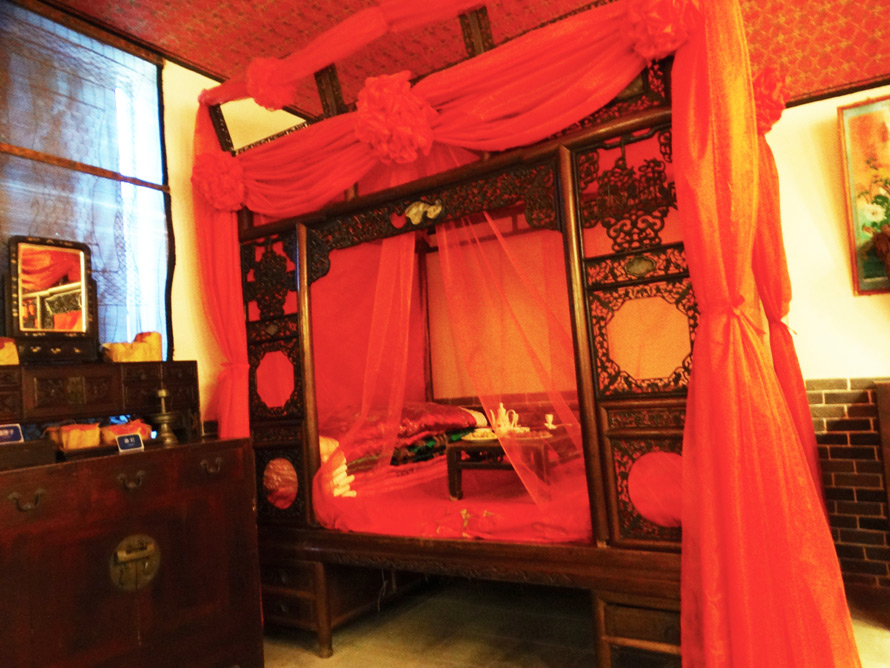 张格庄民俗博物馆一处较大的房间里,还原了早年当地结婚的风俗和婚房布置,大红的纱帐、大红的床铺,以及陪嫁的红木箱子和梳妆盒等,房间里摆放的楸木雕花大床以及楸木大立柜让人眼前一亮,虽没有皇家御用品那般气派,但也充分展示了当年大户人家的风采。