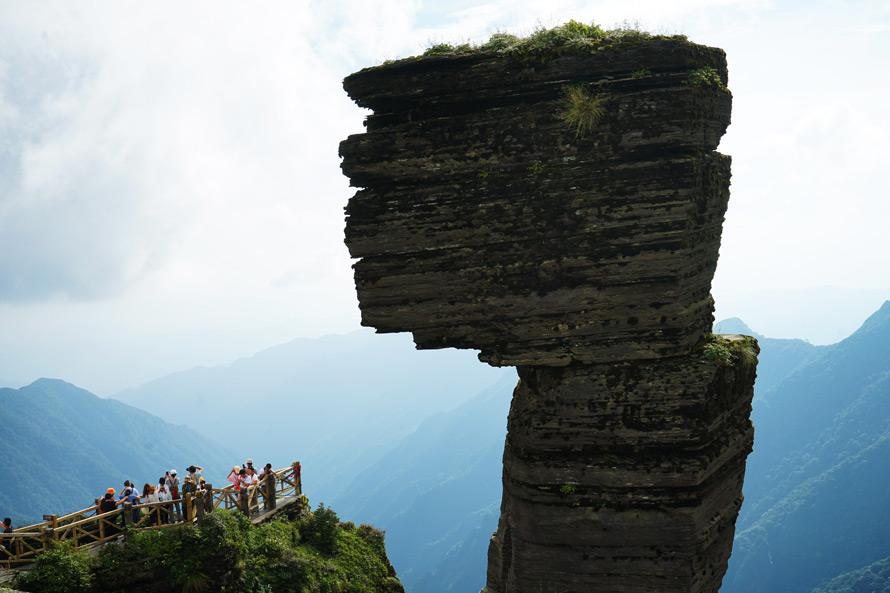 蘑菇石对面是梵净山又一标志性景观翻天印,,这处山崖的顶端平铺着一面石台,一块巨石恰如一方巨印倒置于平台之上,人称“翻天印”。自古便有仕途求官之人为祈如愿,在此叩拜。