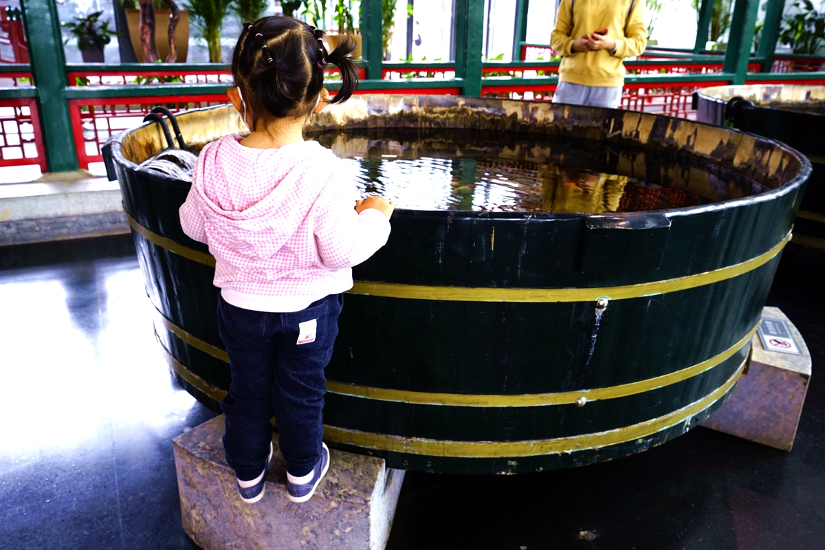主馆一层的中央大厅有八个养着不同品种金鱼的木盆,人称木海观鱼,是孩子们感兴趣的参观点。鱼儿在水中游来荡去,飘逸的尾巴,似扇面,悠闲自在地摇摆不停。不同品种的金鱼,与质朴的木盆构成一幅幅灵动的画面……
