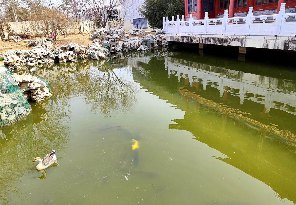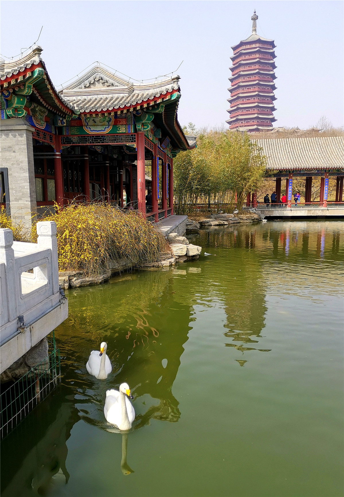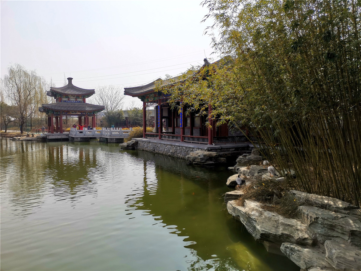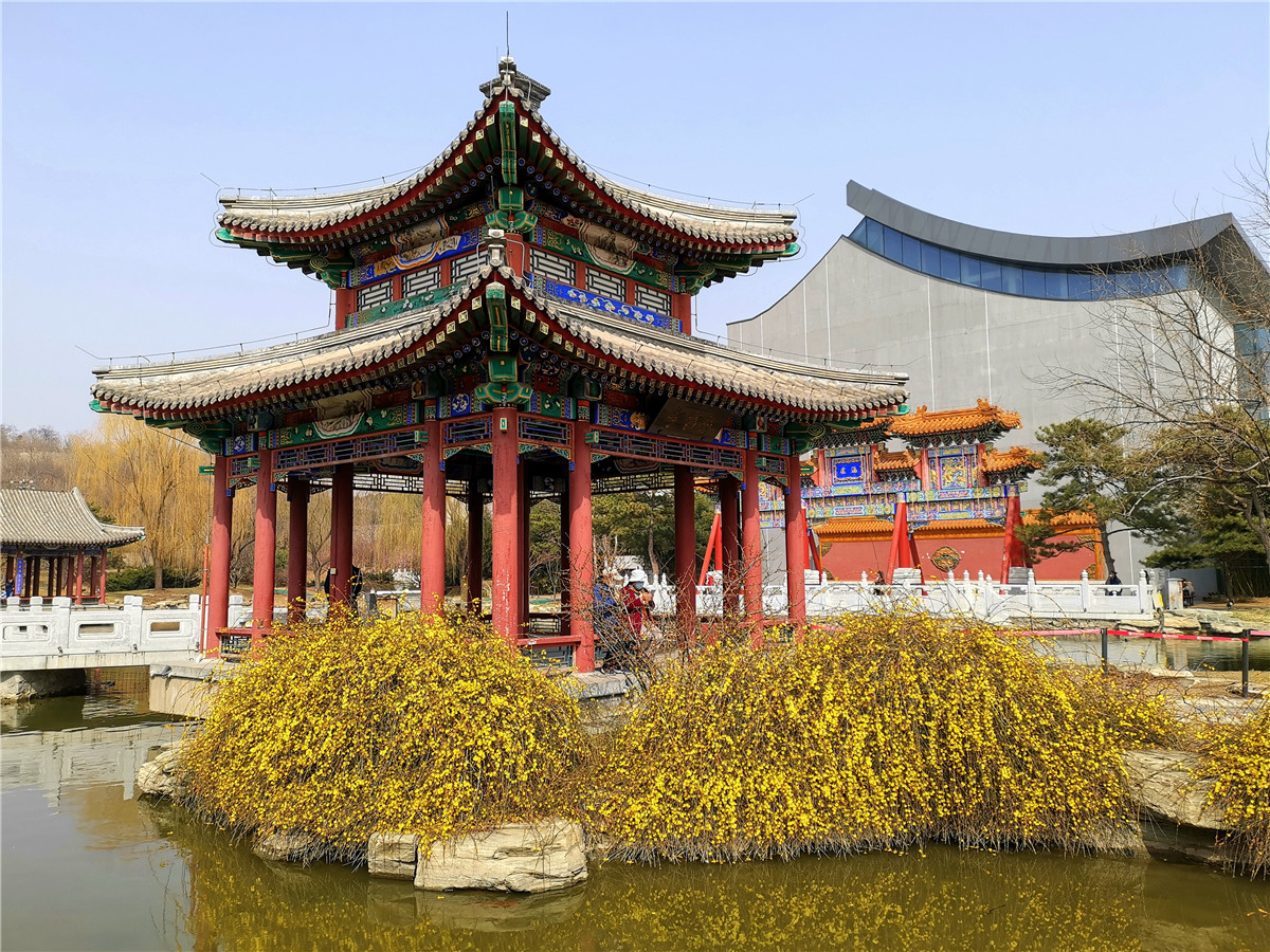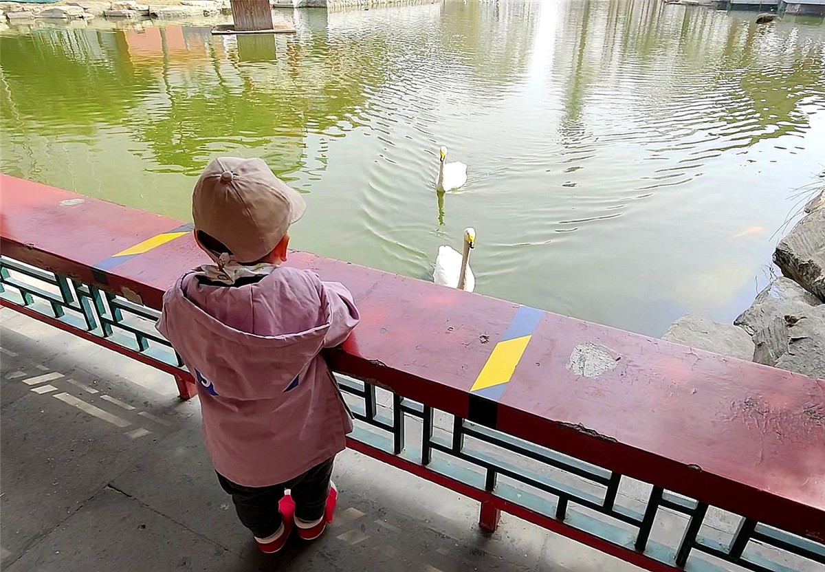室外馆的塔影别苑,半亩轩榭、染霞山房很值得带娃转转。塔影别苑景区将桥、堤、岸、坊、溪水巧妙地融为一体,碧波粼粼中游动的黑、白天鹅、野鸭以及岸上的孔雀吸引孩子们的目光。早春时节,园中的桃花、迎春花竞相开放,与远处的永定塔构成一幅唯美的画面。半亩轩榭是北方私家园林的代表作;染霞山房是建在山坡上的一处具有北方园林特点的景观,站在染霞山房的平台上俯瞰园中景观,或漫步崎岖的山路让人心情格外愉悦。