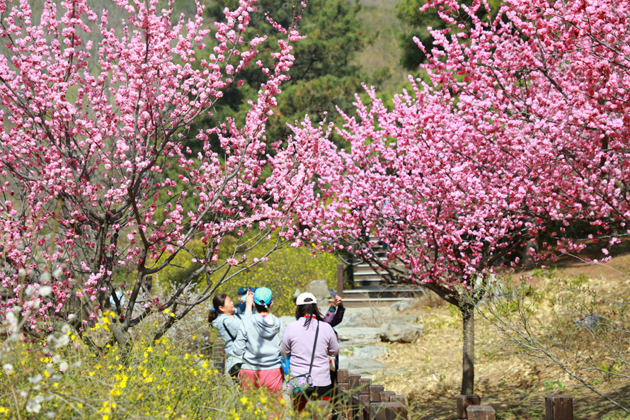 赏梅观景的游人熙熙攘攘,大家纷纷用手机或相机以各种角度拍下这美景。