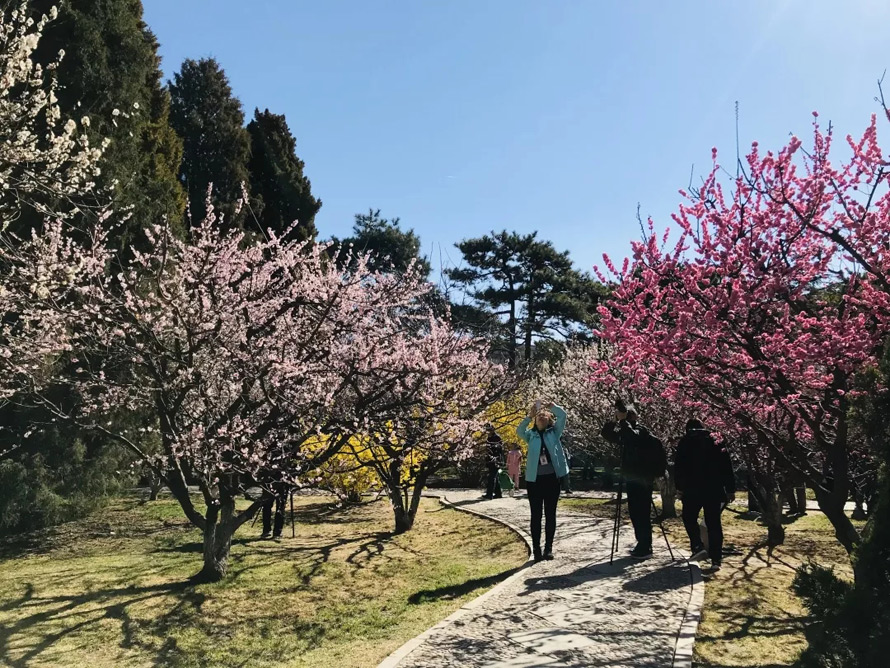 赏梅观景的游人熙熙攘攘,大家纷纷用手机或相机以各种角度拍下这美景。在一株宫粉梅花旁,我与饶有兴致的张先生交谈,他告诉我他今年65岁,喜欢在春天赏花,在来这里之前,他已经在天坛公园拍了不少玉兰花的照片。