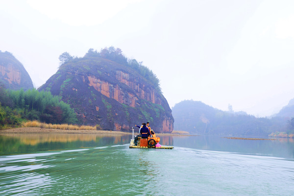 龙虎山的竹筏游类似武夷山的九曲,但竹筏已不是往年由竹杆捆绑的了,而是用一根根空心圆钢做成竹筏的外貎,刷上绿漆后很难分辨出,乘坐很安全,也不会有水花溅湿鞋,是一件很享受的事。