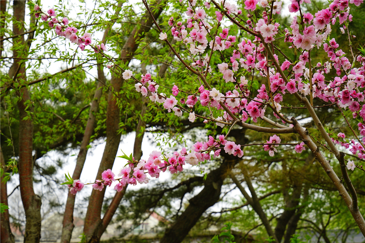 漫步园中,西府海棠、垂丝海棠、‘绚丽’海棠、‘王族’海棠等逐步进入盛花期。湖边、山坡上的连翘、榆叶梅、碧桃等争奇斗艳,形成了碧水春花惹人醉的美景。不少人在花海丛中流连忘返合影留念;不少人用手机相机记录下这一幅幅唯美画卷;更有不少野外写生的少年儿童拿着画板,悉心描绘着“江南水乡”的醉美春天。