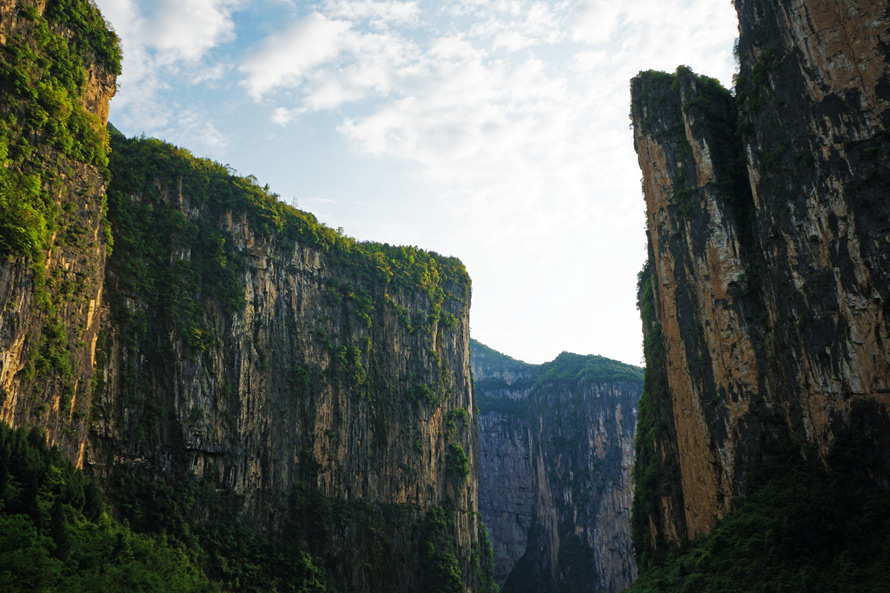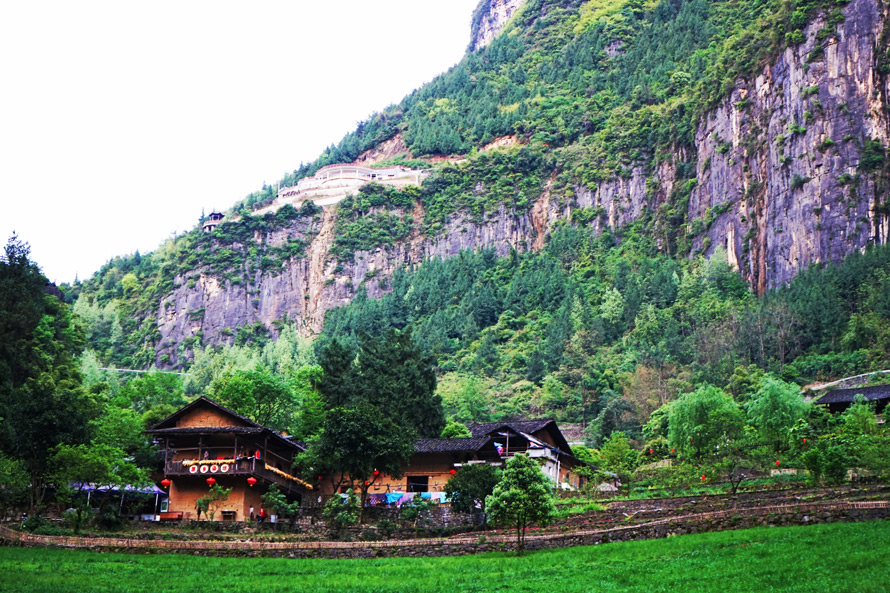 村子的尽头是一片深深的峡谷,远远望去,似乎有三座大山错落成品字样与日月对峙,又像是一道山门,因形状和险峻酷似三峡之首的夔门,被世人称为“旱夔门”,也是这里的“第一山门”,山门下有长3公里的迷宫河,河谷两岸树木茂盛,四面被千仞绝壁围绕,让人不辨来路。随意在村子里游走,颇有置身桃花源之感。旁边的山路可登上旱夔门的顶峰,山顶俯瞰,云雾漂浮。