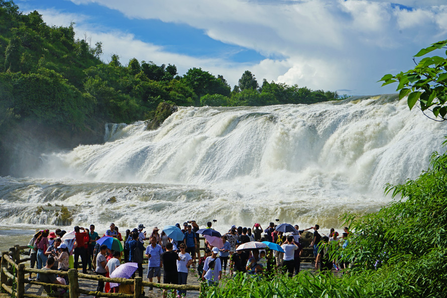 我抵达的这里的时候,车子还没到景区,便在附近的路上透过苍翠的林木缝隙看到巨大的瀑布,轰然作响。进入景区后,沿台阶下行大约5分钟,便到了瀑布的下方,瀑布下面的潭水叫犀牛潭,深17米,奔腾的瀑布从几十米高的悬崖绝壁上直泻潭中,激起一朵朵晶莹的浪花,卷起一个个漩涡。那轰鸣的水声震耳欲聋,那溅起的水珠向四面飘洒,天气晴好的时候,阳光折射出七色彩虹。