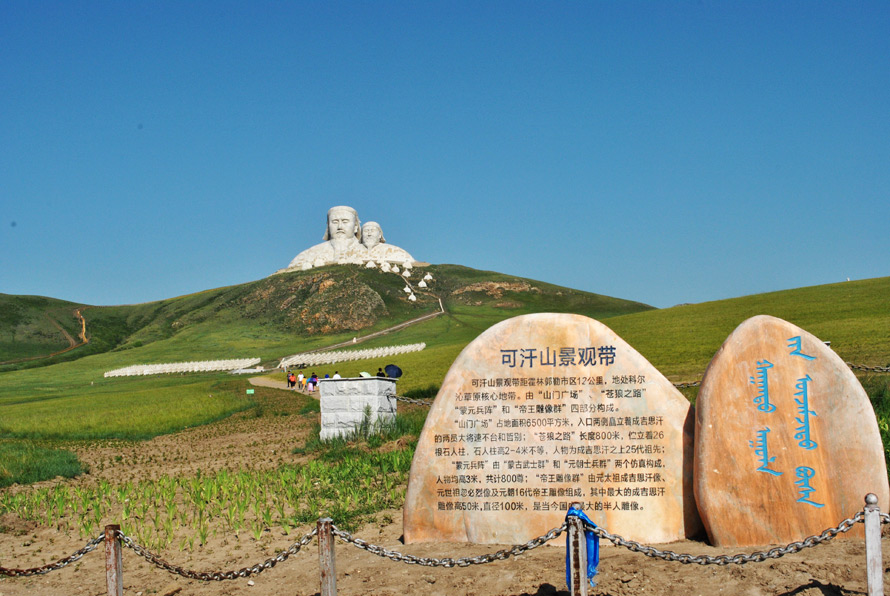 游走的途中,有一个可汗山景观带,是一个景区吧,视线里的山川起伏于草原,看起来不高,但很美,山上有可汗山蒙元帝王雕塑群、16座帝王头像和蒙元兵阵雕塑群,山门广场正中自然石上刻“可汗山”蒙汉两种文字。山门路口,两位蒙元门神即成吉思汗的两员大将(哲别,速不台)雕像分列两侧,进入山门便是长达800米的“苍狼之路”,路侧伫立26根石人柱。