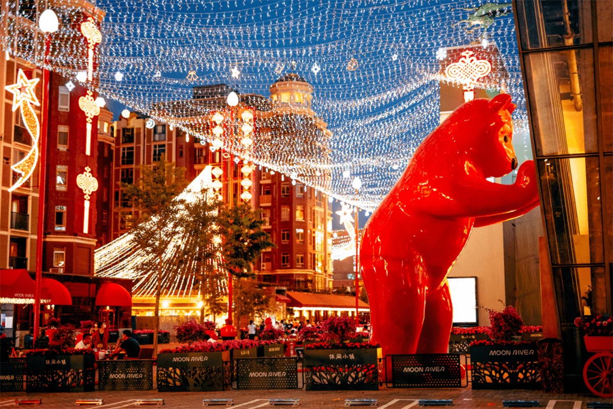 走进小镇,一片欧式风格建筑,恍如异国他乡。小镇有吃喝玩乐一体化的休闲街,人造草坪上形态各异的雕塑,“张占占造梦”的兔子和PUPU熊以及免费的儿童游乐场等,适合亲子家庭旅游观光。