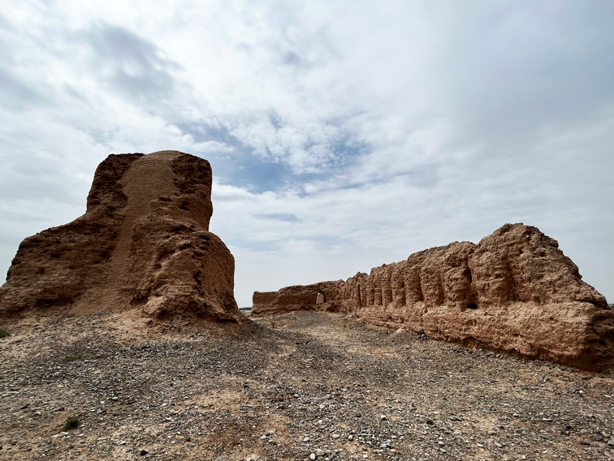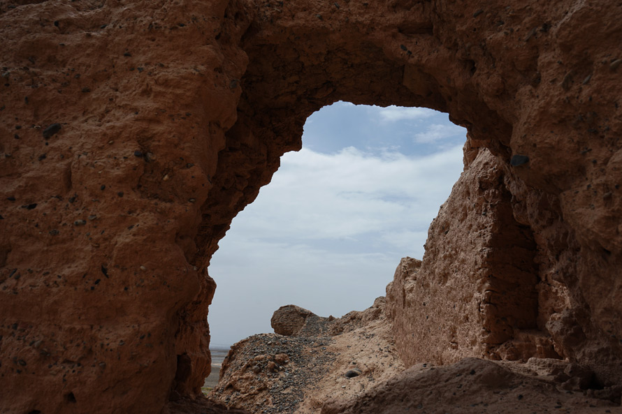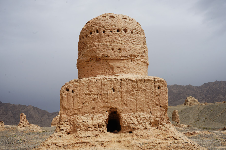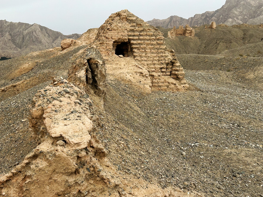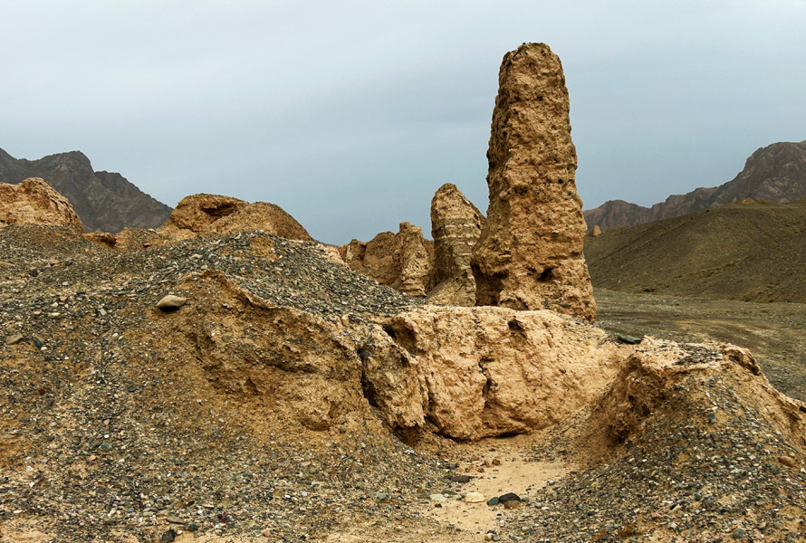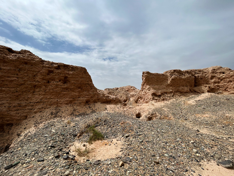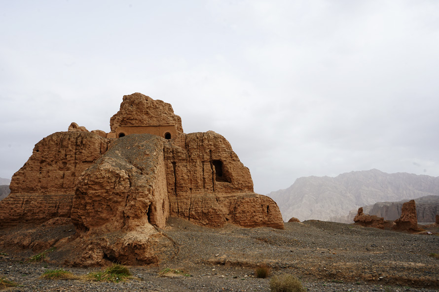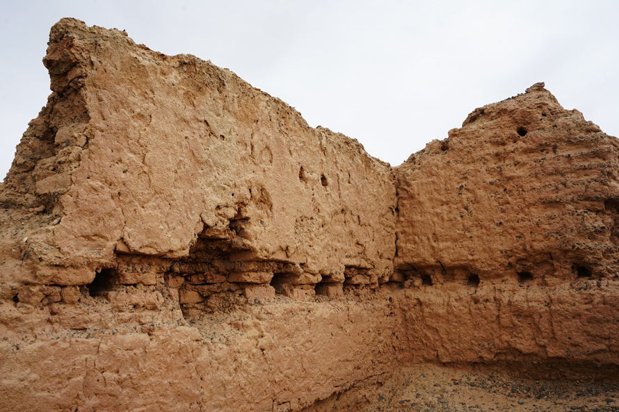 小心翼翼地爬上东寺所在的山丘,佛寺厚厚的墙壁依旧坚实挺拔,一些夯土墙壁的顶端还能保留着搭建木梁时的孔洞,一间间僧舍的空间清晰可辨。站在遗址一侧的高处俯瞰,空旷的荒原上这些高地错落的残垣断壁,与黛色的天山余脉以及黑褐色的戈壁,形成了奇妙的水彩画卷,这种视觉交错的感觉让人内心不由得生发一种深邃的宁静。