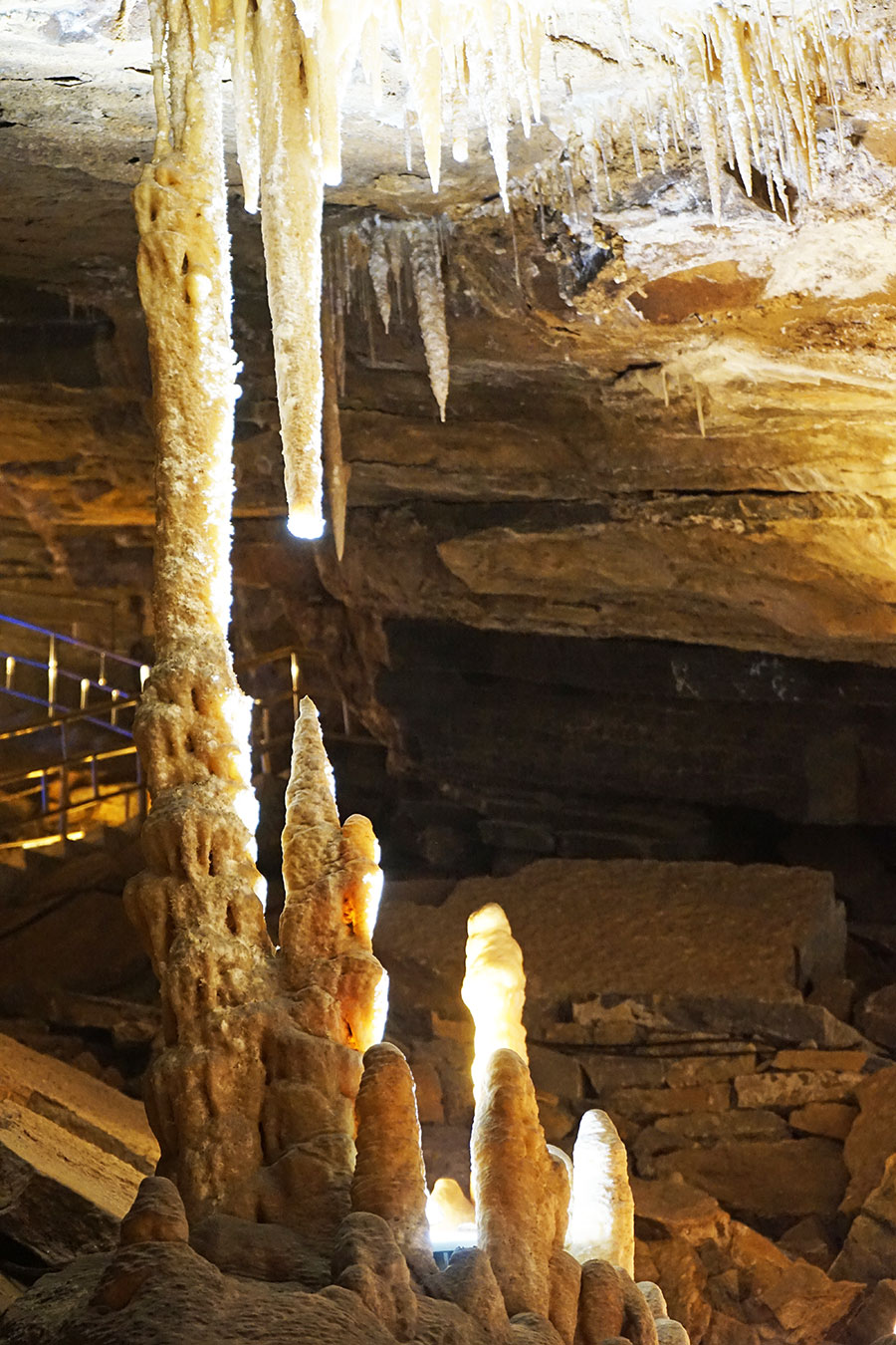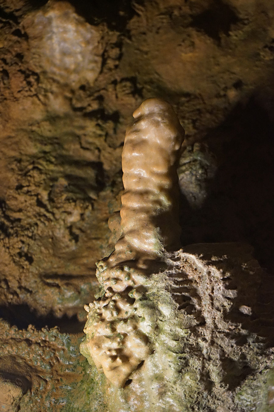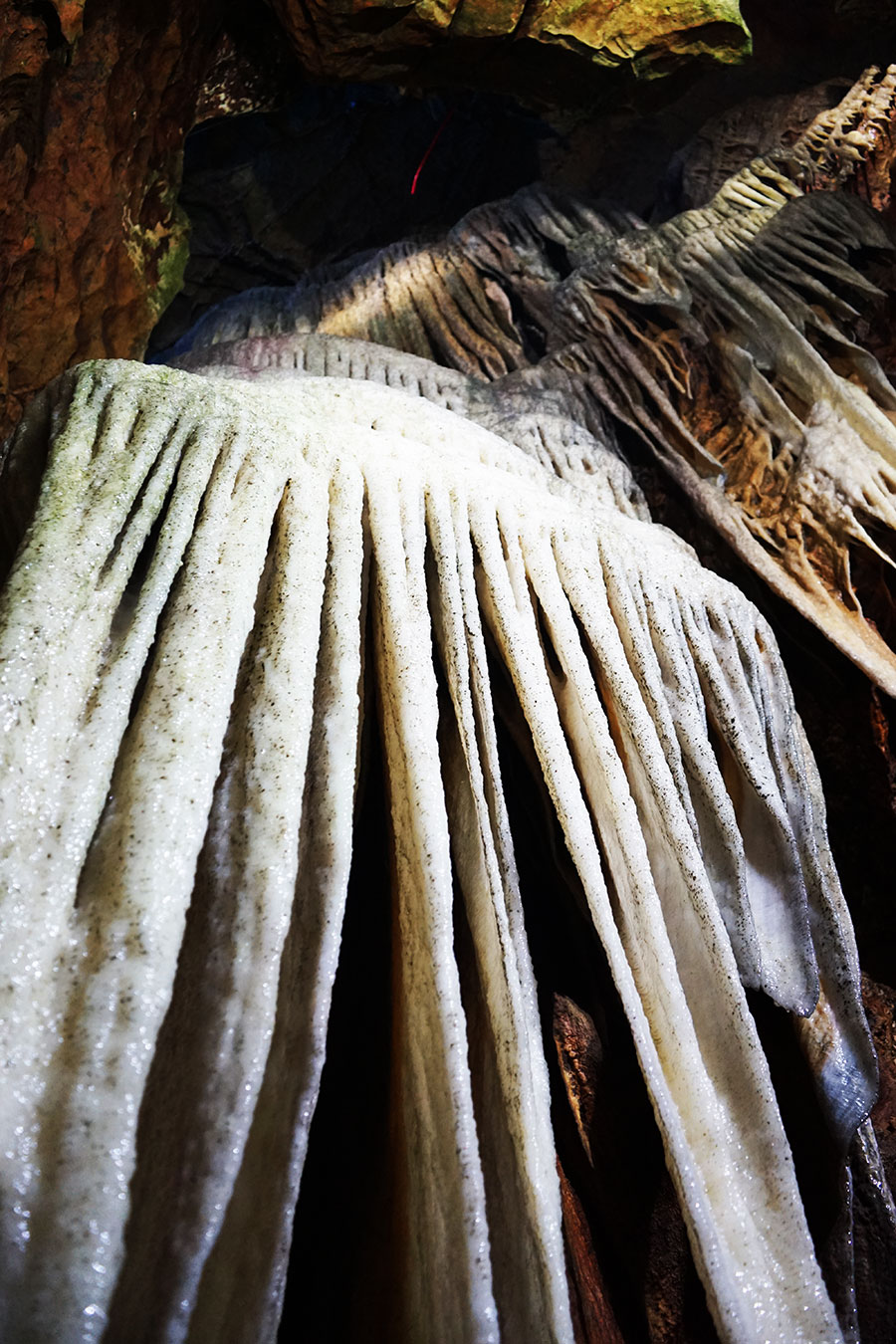 据说钟乳石的形成是自然界一种化学反应。或许是在亿万年前,地壳变动隆起了大山,在这个过程中产生了一种碳酸钙岩石,也叫灰石,之后的岁月时不时有雨雪从天而降,这些含有二氧化碳的水分解了灰石后,又生成碳酸氢钙溶液,这种溶液顺山石缝隙涓流而下,抵达山洞各处,此时,空气是无形的推手,与渗透下来的溶液完美合作,悄悄地开始了化学反应,产生了新的物质——碳酸钙,从此,嘀嗒不止的溶液落地生根,开始了生长;时间,漫长了等待,也完美造就了大自然的奇观。