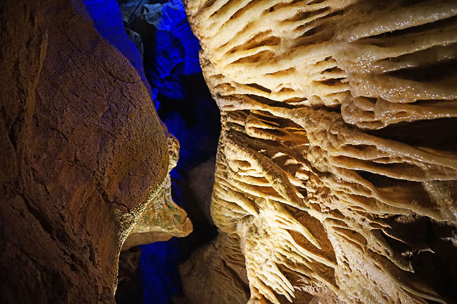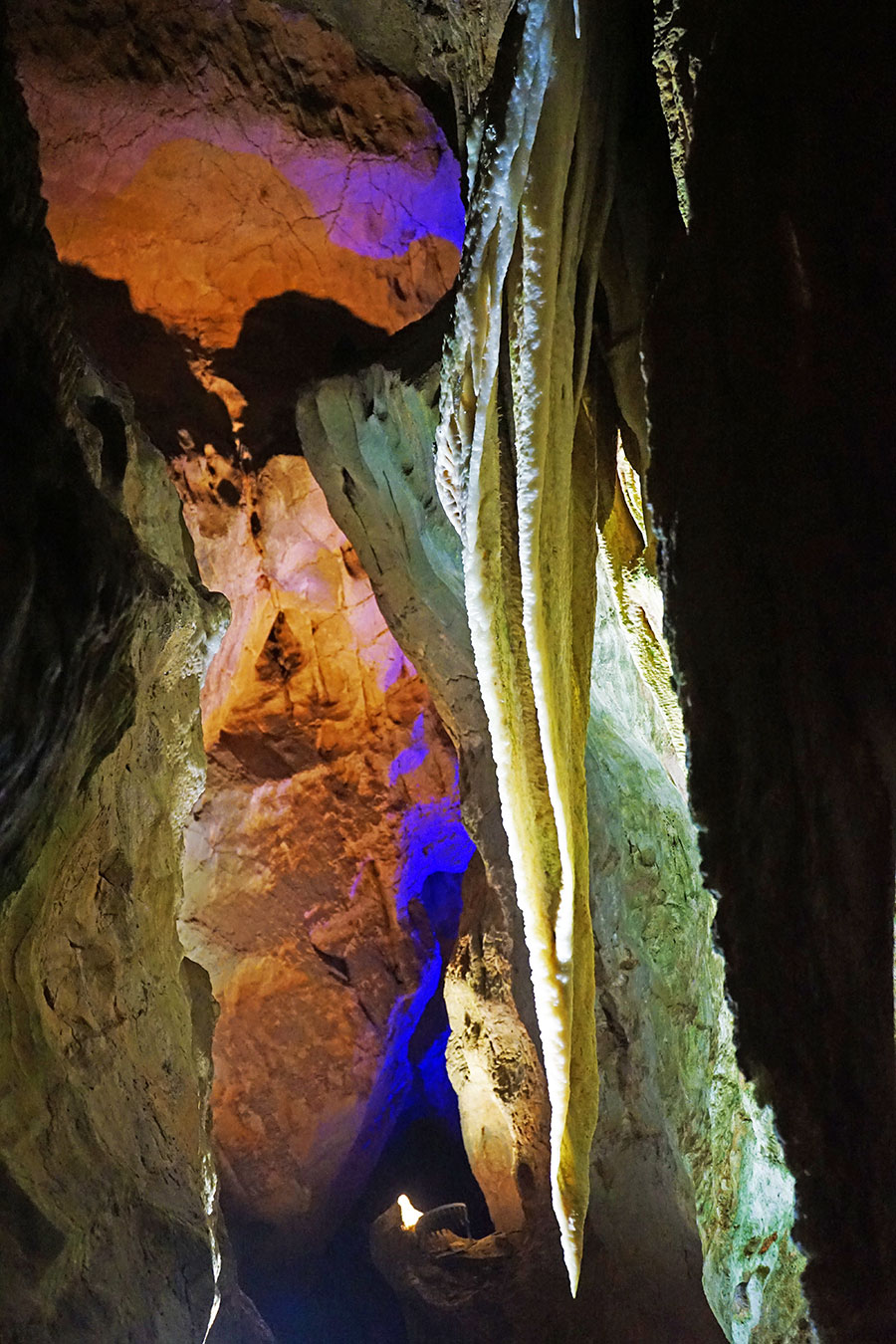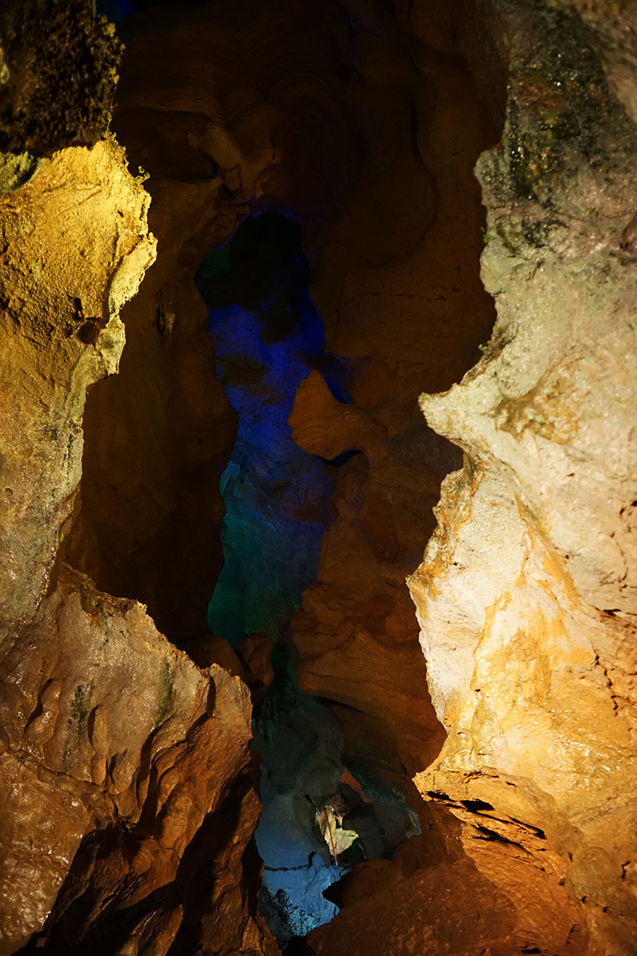 洞内的光线时明时暗,各种颜色的灯光打在钟乳石上,呈现出各种色彩,宛如神话片里的深海龙宫,各种式样的钟乳石有的生在洞壁上方,有的生长在洞壁角落,有的色白如雪、质纯似玉,有的微黄如蜡烛,有的形状像塔、像柱、像手掌,还有的像瀑布以及堆起来的土豆等等。