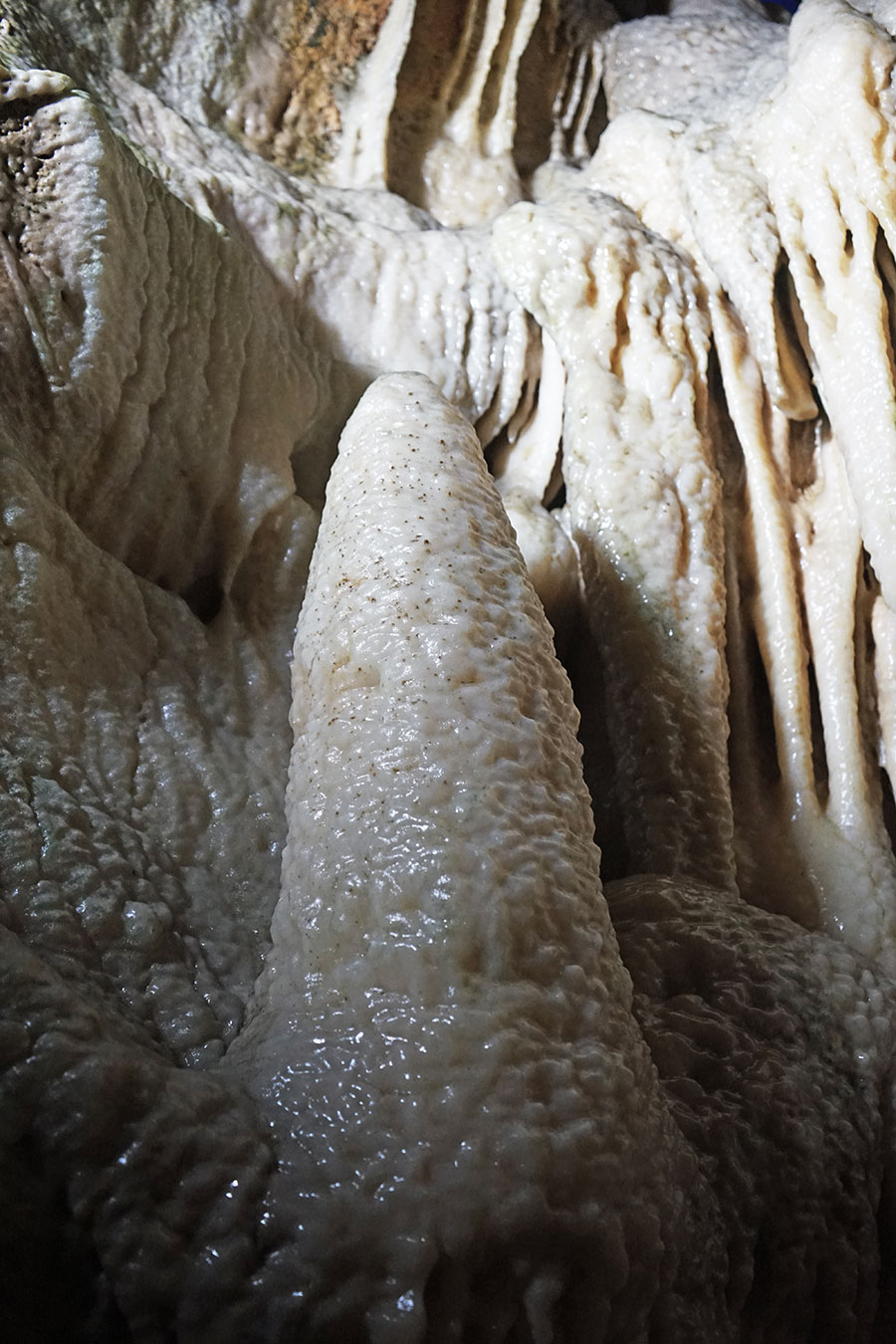 亿万年时光的漫漫已远超人类的想象,现在的我们所知道的是,那些沉积在洞顶、洞壁和洞底的碳酸氢钙溶液,现在长成了钟乳石,洞底的溶液堆积形成石笋,钟乳石与石笋相连形成了石柱,以及形态各异的奇怪石头。