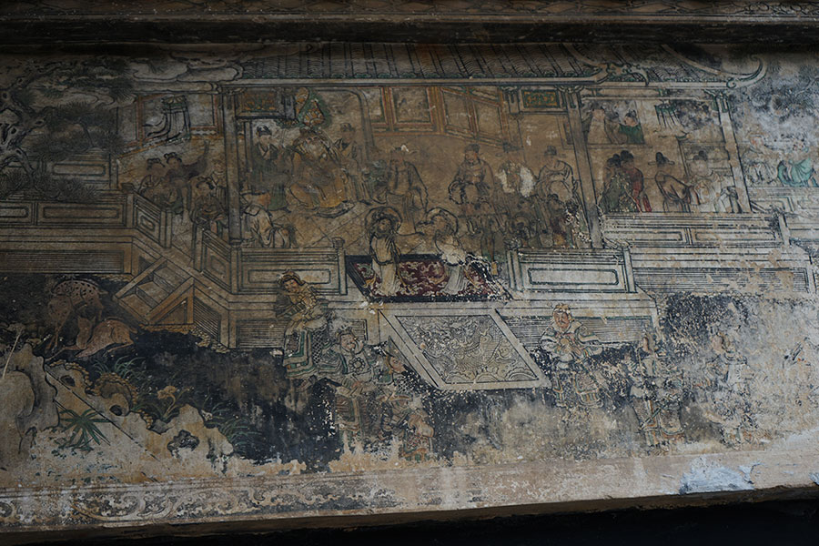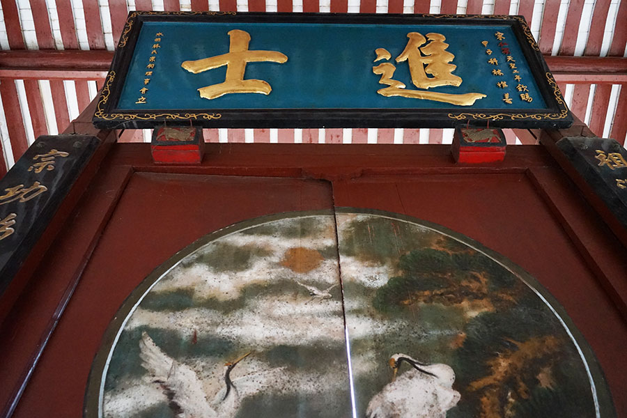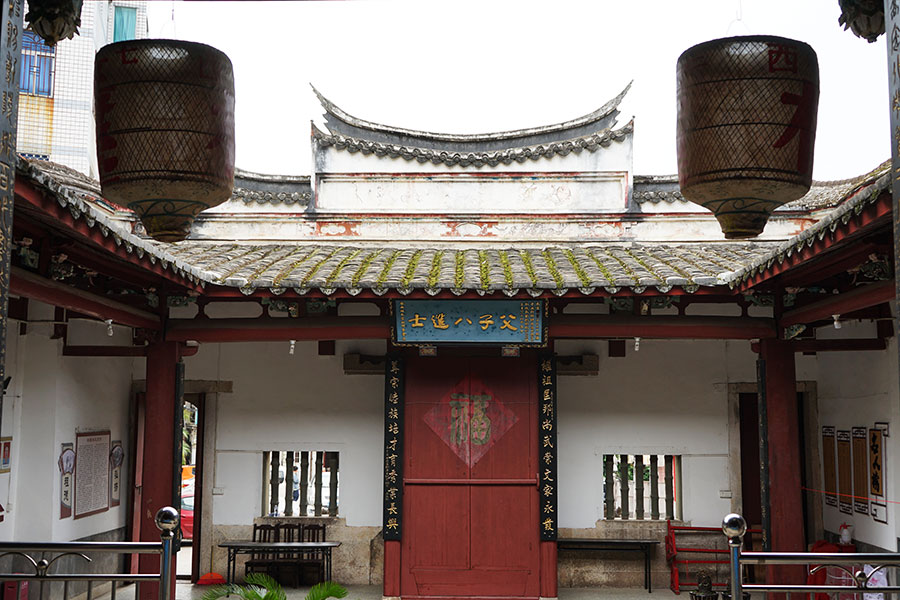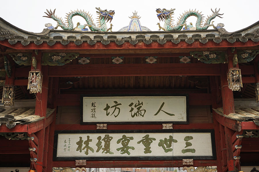 林春泽故居位于主街最南端,大门口高悬着红底金粉的匾额,上书“六朝大老”四个大字。据说此匾是万历七年兵部尚书赵彦所立,记的是林春泽因历经成化、弘治、嘉靖、隆庆、万历六朝,被誉为“六朝大老”的典故。匾额下贴着几幅红色的对联,其中大门的楹联写着:“三世琼林第,六朝大老家”,横批是“碧喦生辉”,短短十几个字写尽了林春泽身历六朝,父子孙皆为进士,蒙皇恩赐琼林宴的历史。拾级而上,首先映入眼帘的是一扇插屏门,背面的匾额便是“父子八进士”。