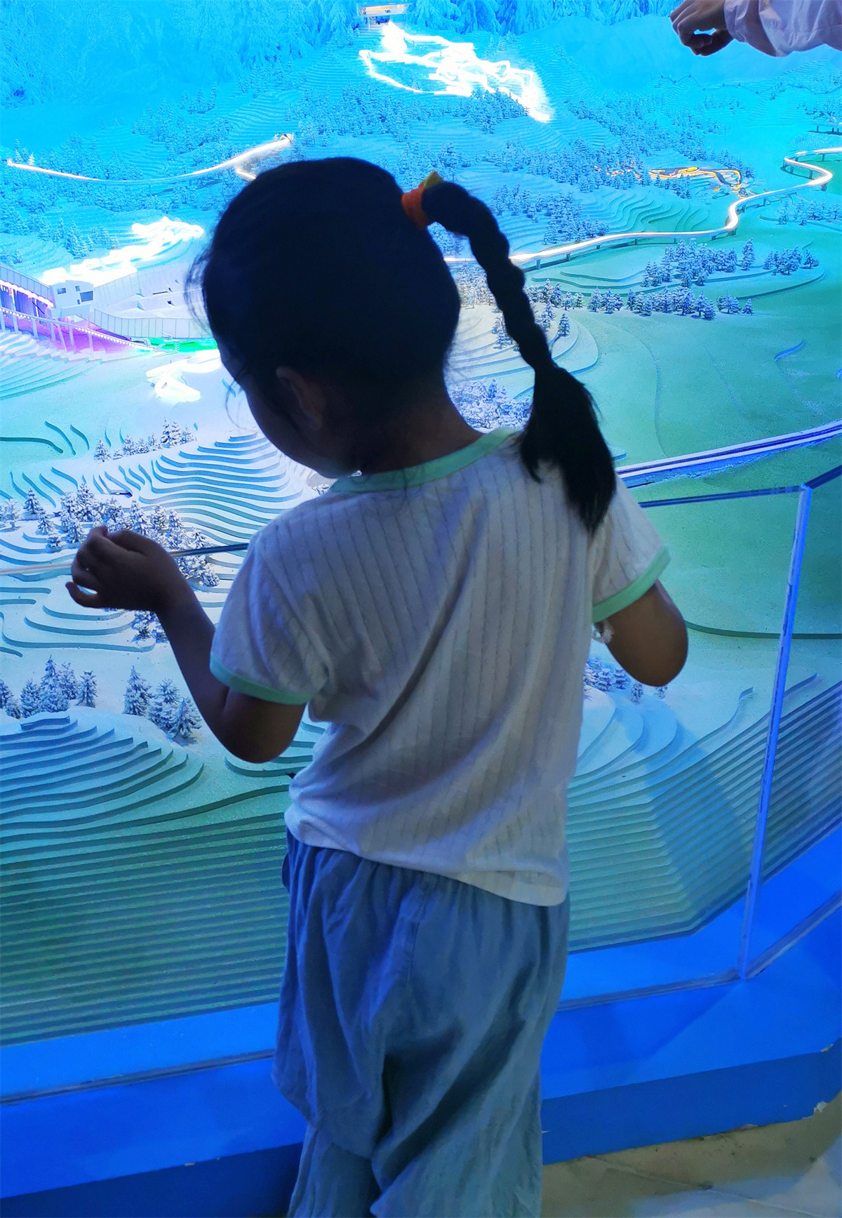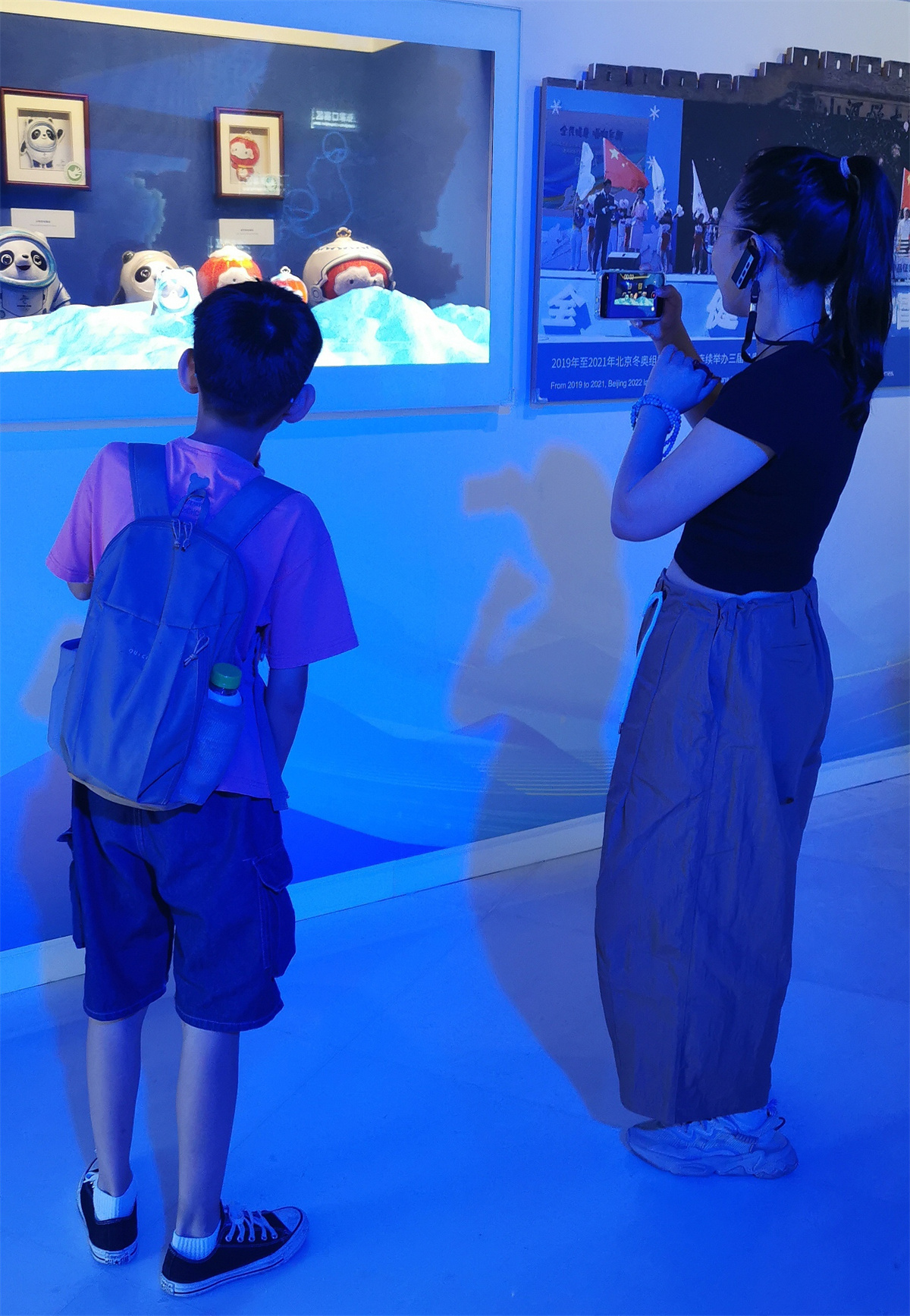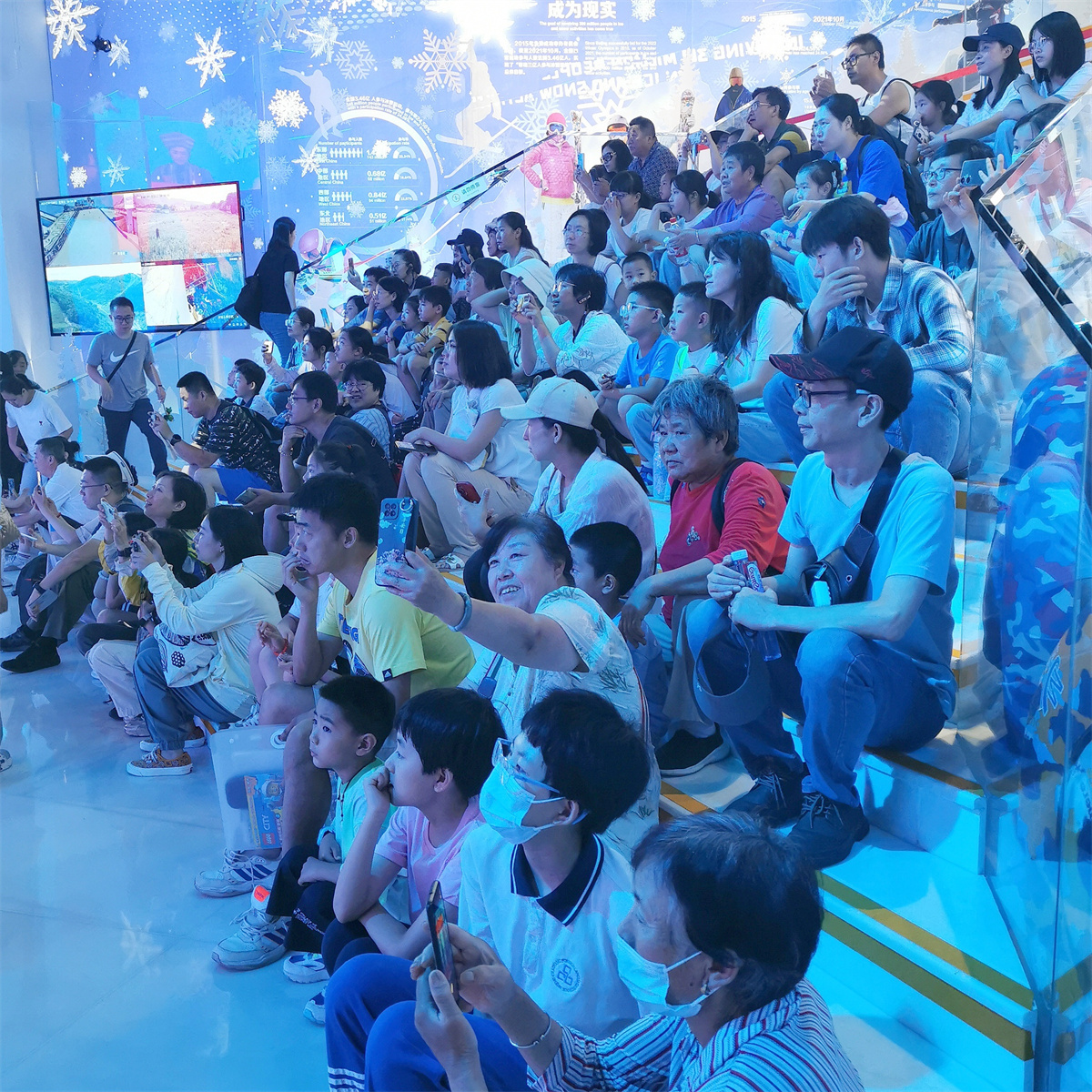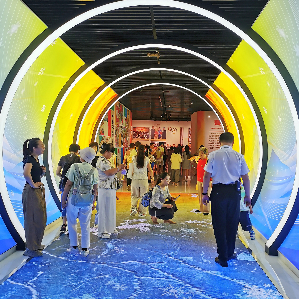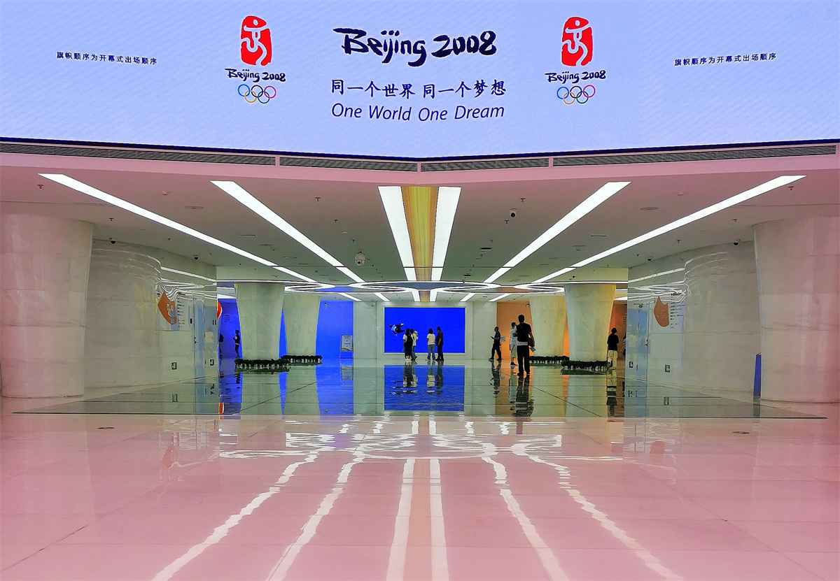 展厅分为三大块,均在地下一层。第一部分,介绍2022年冬季奥运会。第二部分,介绍2008年夏季奥运会。第三部分,重点介绍曾经承担两届奥运会的城市——北京。这三大展馆,充分利用声、光、电一体的现代化手段,让参观者倍感新奇,令人眼花缭乱。