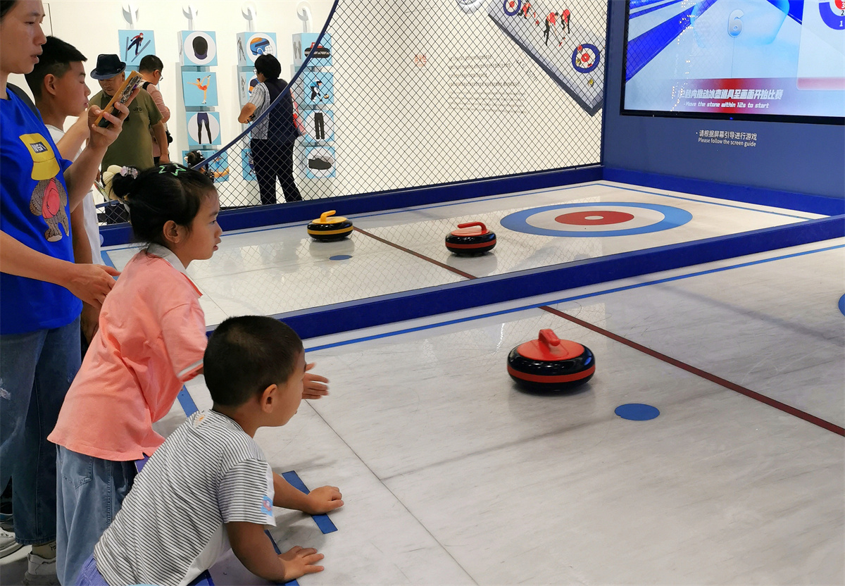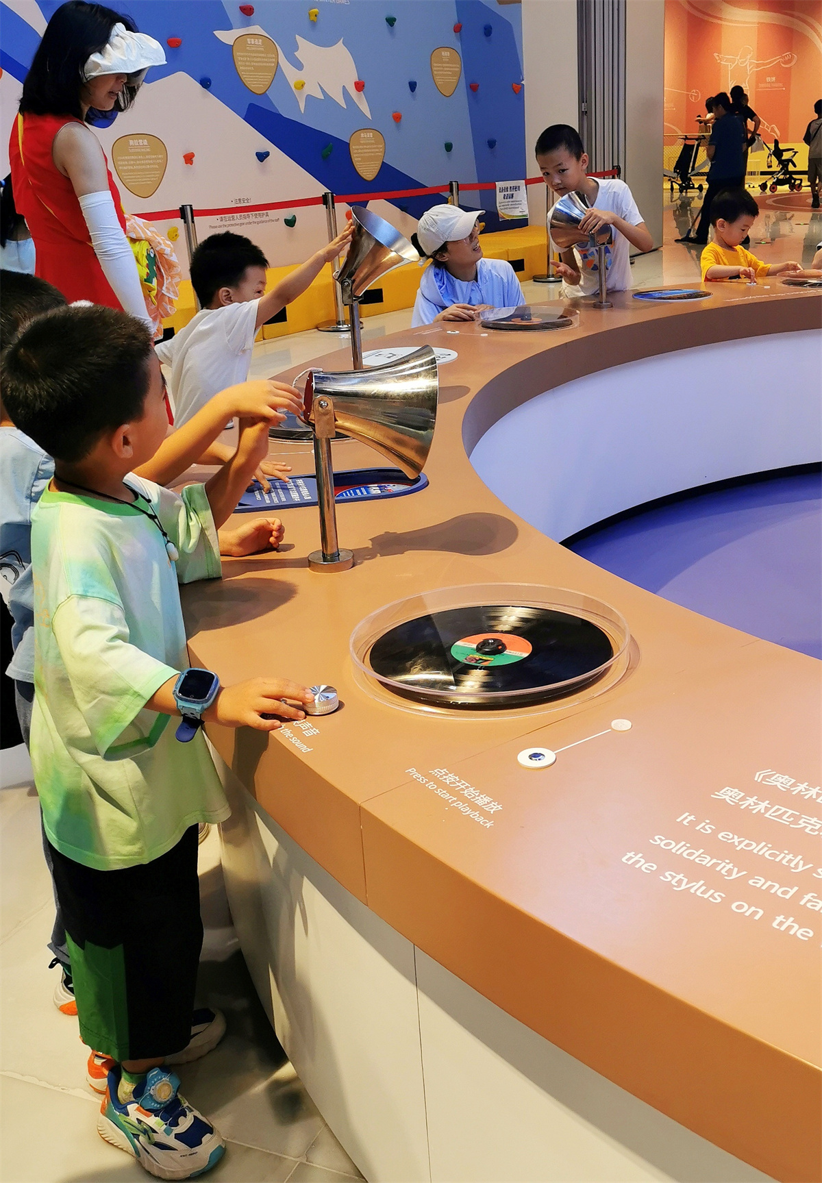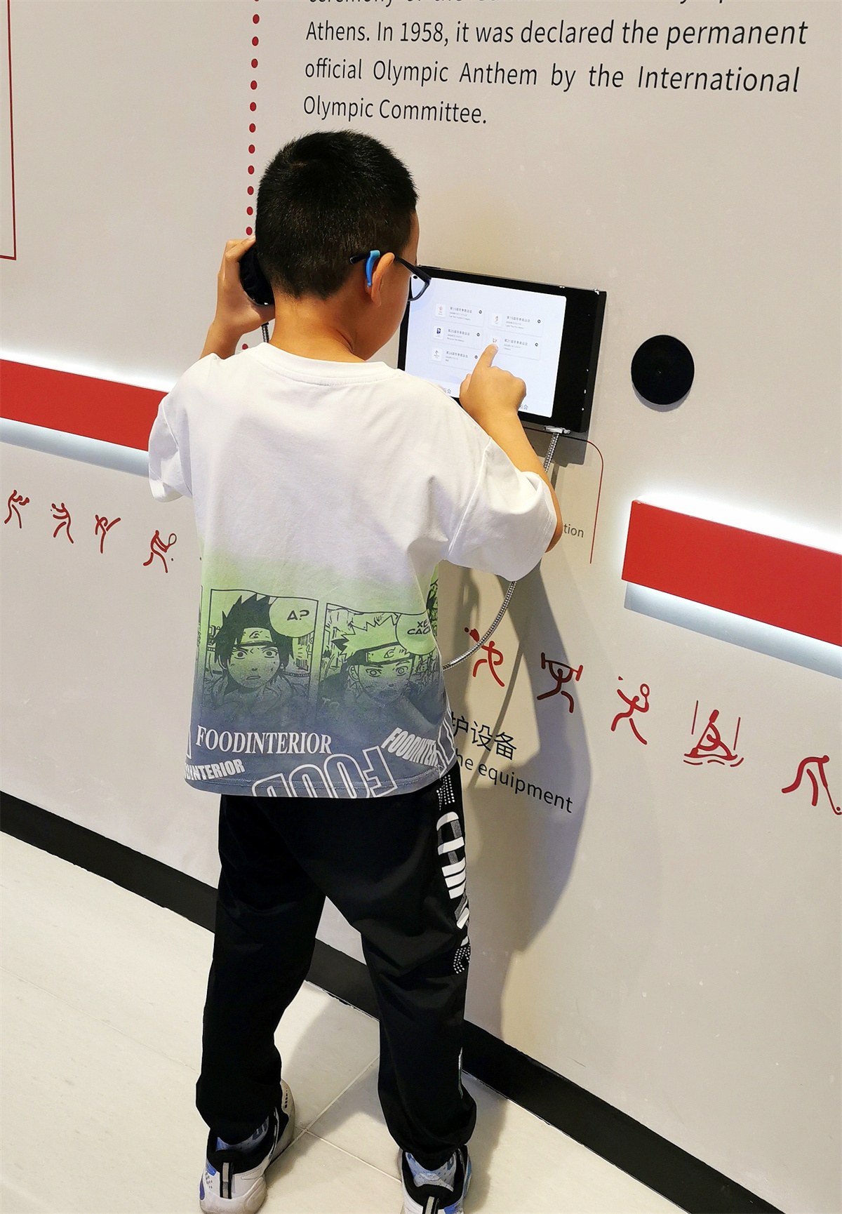 最后一个展区为“体育世界”。这是一个沉浸式体验区,也是带娃参观博物馆的重点部分。这里设置了冬季奥运会展区、夏季奥运会展区和奥运故事展区。“花样滑冰、跳台滑雪、高山滑雪、冰球、冰壶、雪车”等冬季奥运会体育项目体验和“投掷、拳击、举重”等夏季奥运会运动项目体验是娃儿们最开心的地方。这个区域还能听到历史同期声音:第一首奥运会主题曲、历届冬奥会主题曲、国际奥委会主席托马斯•巴赫先生2020年在国际奥林匹克日的致辞等。在这里,孩子们可以听到1948年传统发令枪声,也能听到2010年电子发令枪声。这些音响也成为一种时代的回忆嵌入人们的脑海中……。