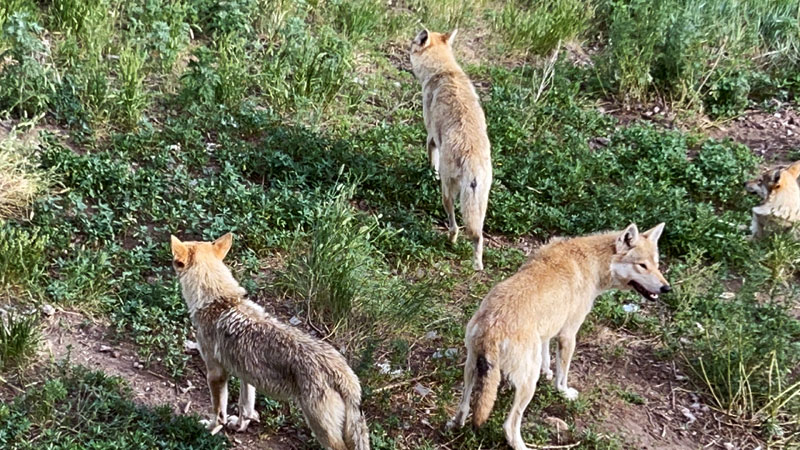实现的远处,一条草原小径上有人骑了一辆摩托车,后满追随者一大群精灵——狼。有人说那是训狼人,或许是吧,他们那么和谐地在草原上奔跑,成为游客的风景。