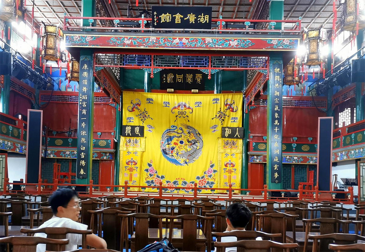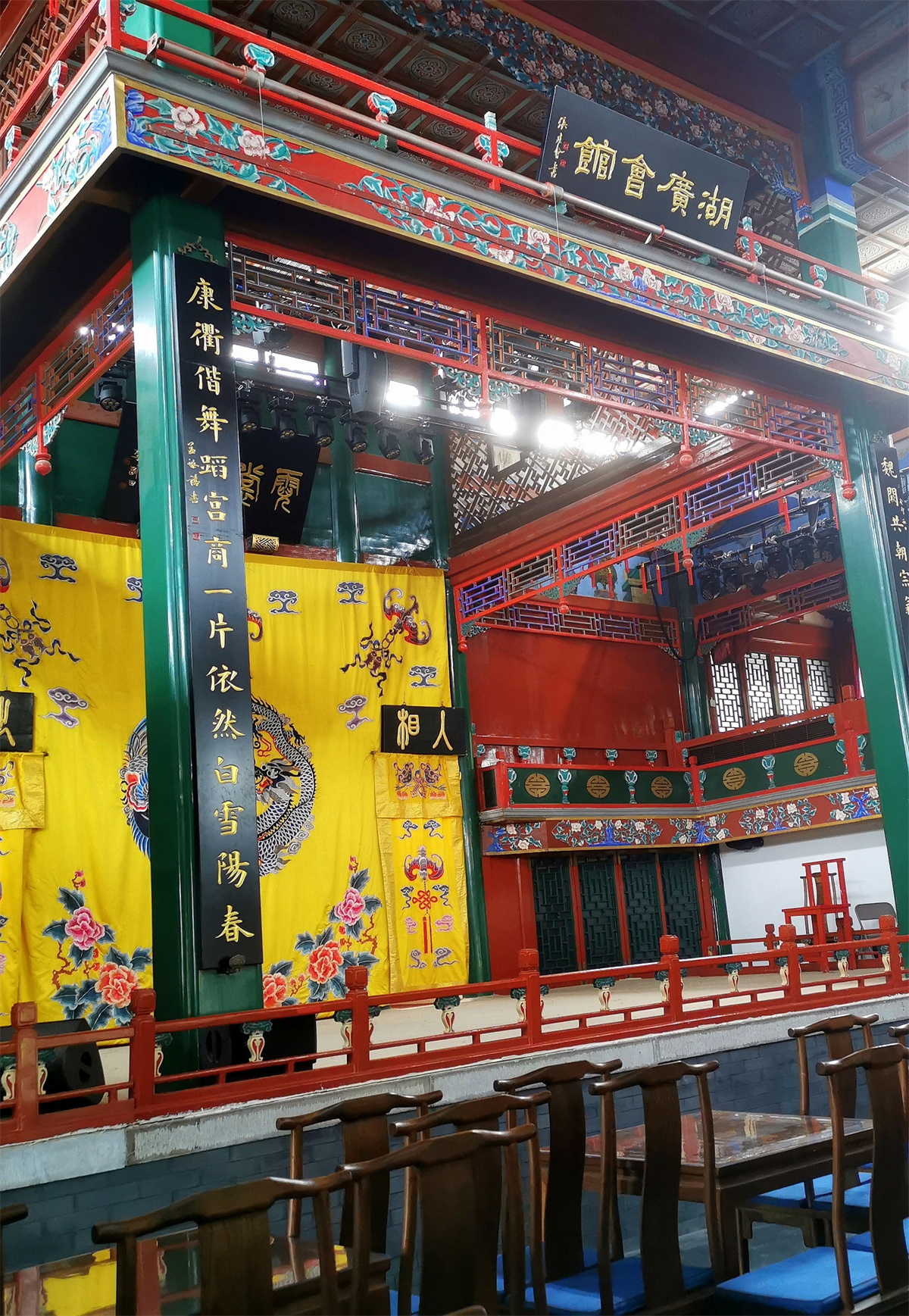 穿过回廊或从展厅走出进戏楼后门,便可抵达与狭小展厅形成鲜明对比的大戏楼。古色古香的建筑风格搭配恢弘的空间格局,让人一踏入便仿佛穿越时空。在这里观戏,传统戏曲的韵味扑面而来,沉浸式的体验带来新奇与兴奋,让人深切感受戏曲艺术的魅力。