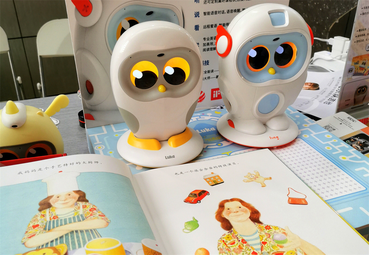 最受小朋友欢迎的,还要数机器人朗读绘本的展台。随意翻开绘本到某一页,轻拍机器人头部,它就能绘声绘色地讲述故事。据展板介绍,这款智能双语学习机器人还具备听、说、看、学、读等多种技能,堪称家长育儿的好帮手。