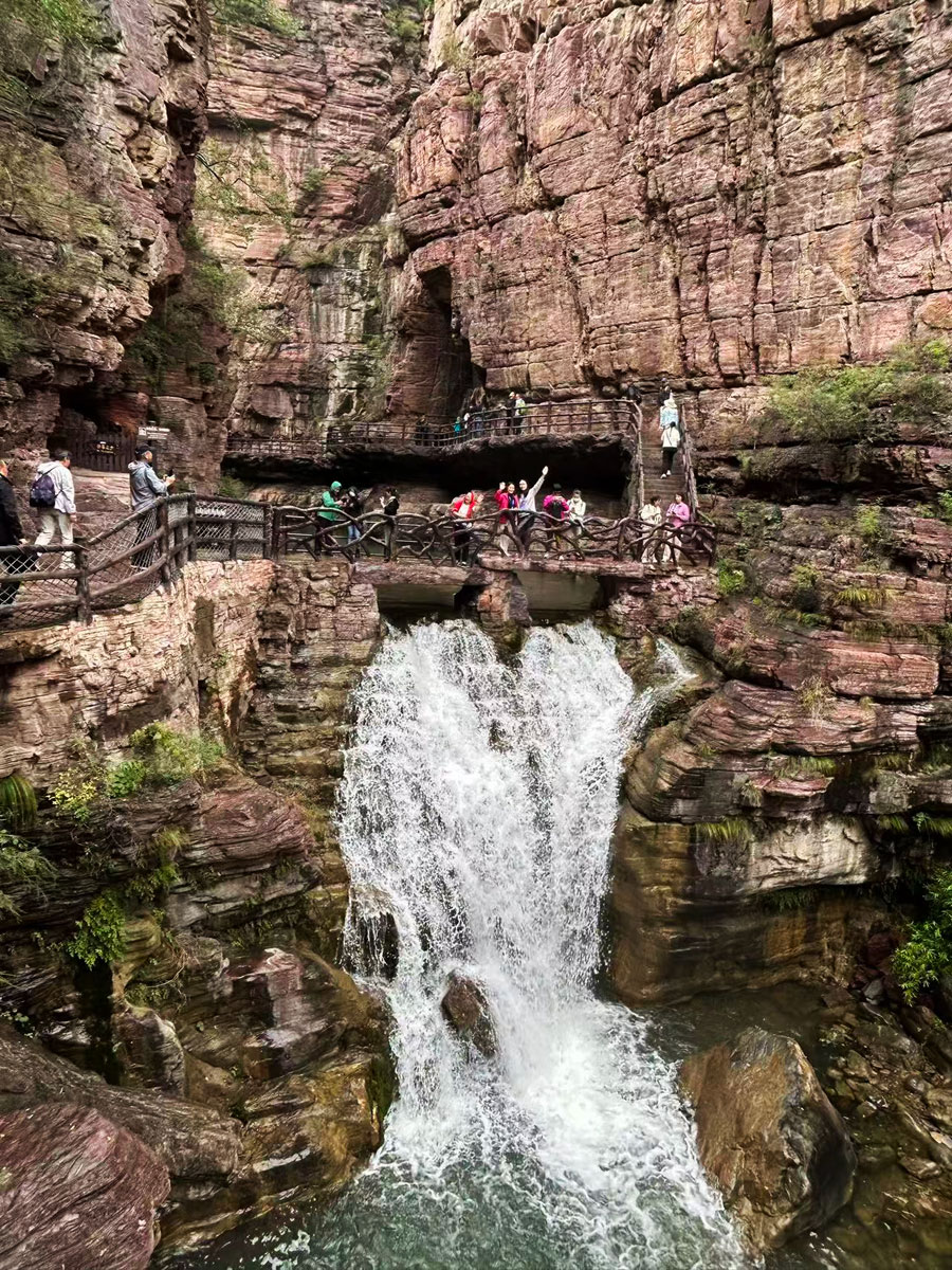 我沿水而行,时而在石桥上,时而在水边。石桥皆就天然岩石凿成,与峡谷浑然一体。人行其上,如行画中。峡谷曲折,每转一弯,便有一番新景致。有时瀑布自天而降,轰鸣作响;有时溪水潺湲,如琴如瑟;有时潭深莫测,凝碧涵虚。而无论至何处,那赭红的石壁总是屹立两旁,沉默地见证着流水千年万载的雕刻。