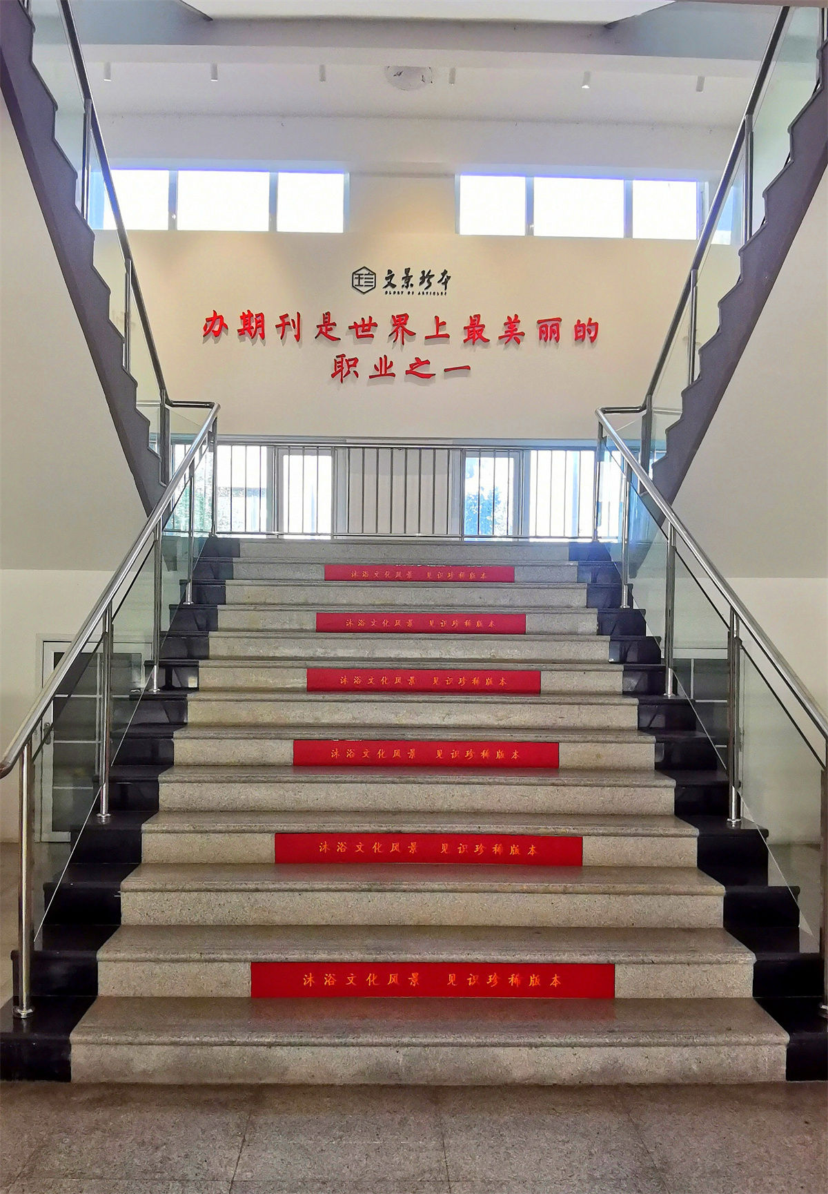 博物馆精心营造的“期刊时空隧道”场景,让参观成为一场身临其境的文化之旅。迈步走向二楼展厅,每级台阶上都印着“沐浴文化风景,见识珍稀版本”的字样,仿佛在提前预告即将开启的精彩。进入展厅前,需走过一段灯光打造的时光隧道,置身其中,200多年前的期刊发展场景仿佛扑面而来,瞬间拉近距离。