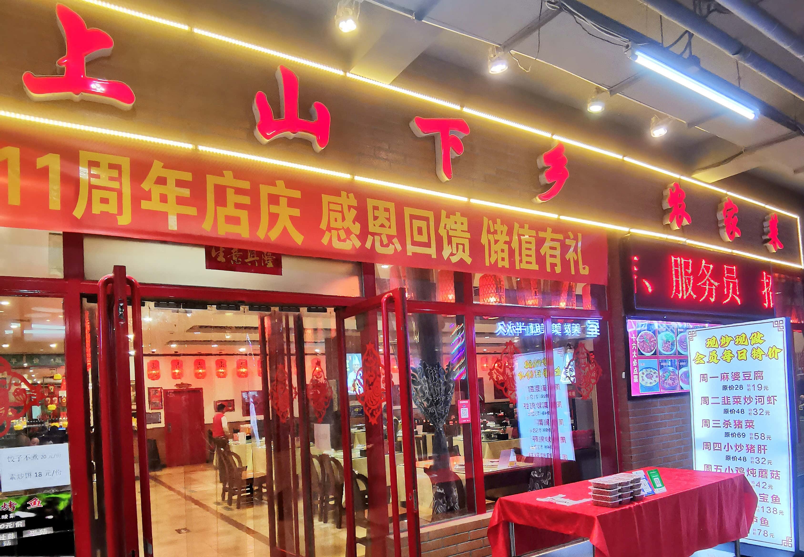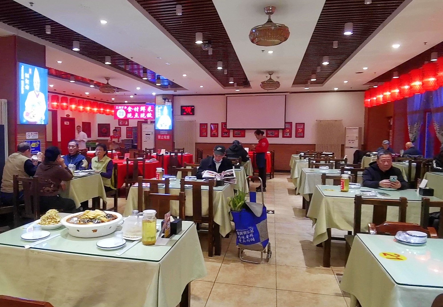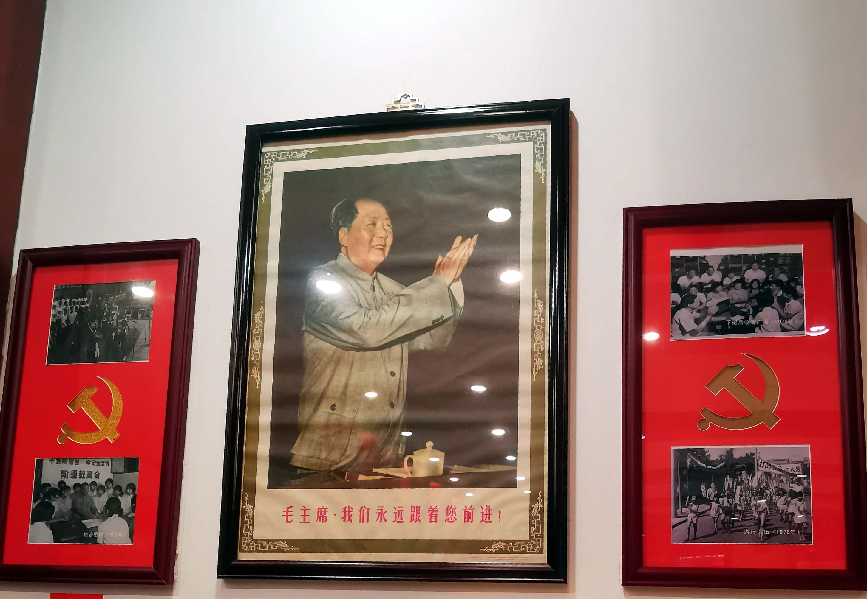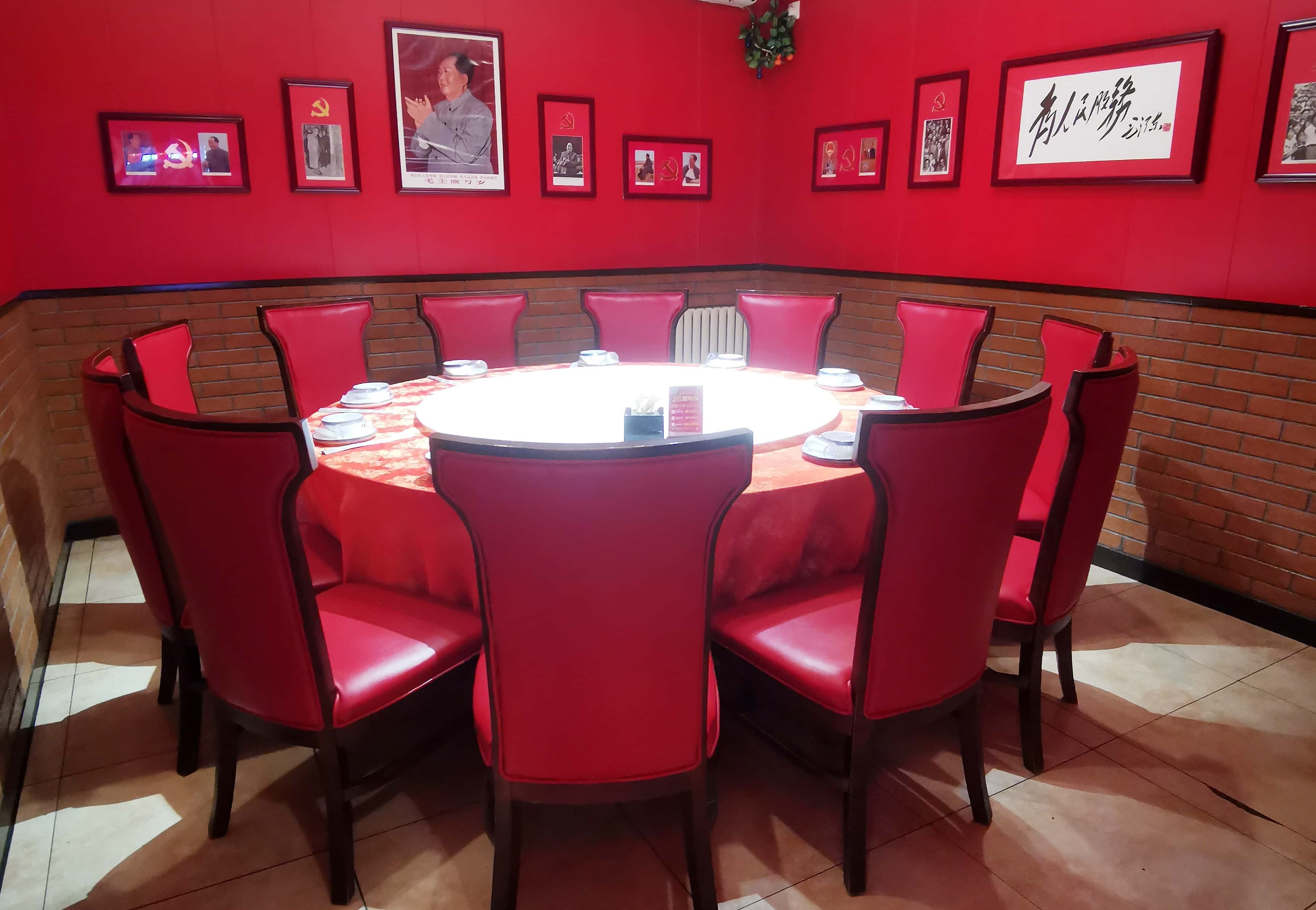这家以知识青年“上山下乡”经历命名的东北农家菜馆,内部装饰得格外红火。竹编灯笼上“上山下乡”四个大字格外醒目,既承载着一代人的共同记忆,也轻易唤醒食客对往事的追忆。就连包间也以“村长”“民兵连长”“会计”命名,满是时代印记;墙壁上悬挂的领袖像、记录当年岁月的老图片,更像无声的讲述者,向每一位进店的人诉说着曾经的故事。