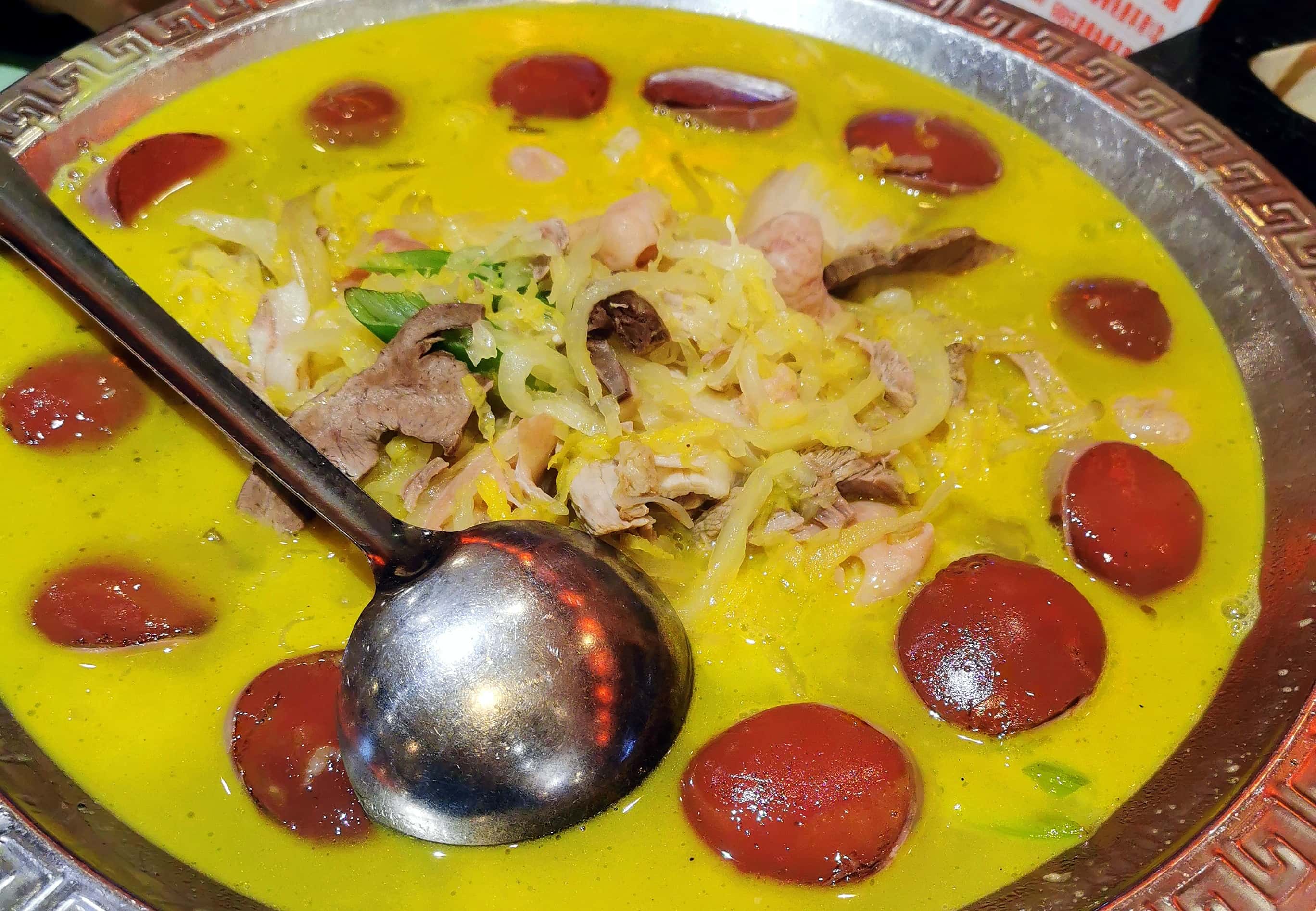 铁锅里的砂锅菜咕嘟冒泡,蒸腾的热气中飘着东北酸菜特有的香气;瓷盆里装的鱼头泡饼泛着鲜润的光泽,那许久未见的“大盆盛菜”场景,让“敞亮”二字自然而然地浮现在脑海。杀猪菜里的猪血是点睛之笔,软糯口感与酸菜的酸爽相互交融;把浸满浓郁鱼汤的烙饼送进嘴里,鲜香味瞬间铺满味蕾。这两道菜,味正、量大、实惠,妥妥的“敞亮”范儿。