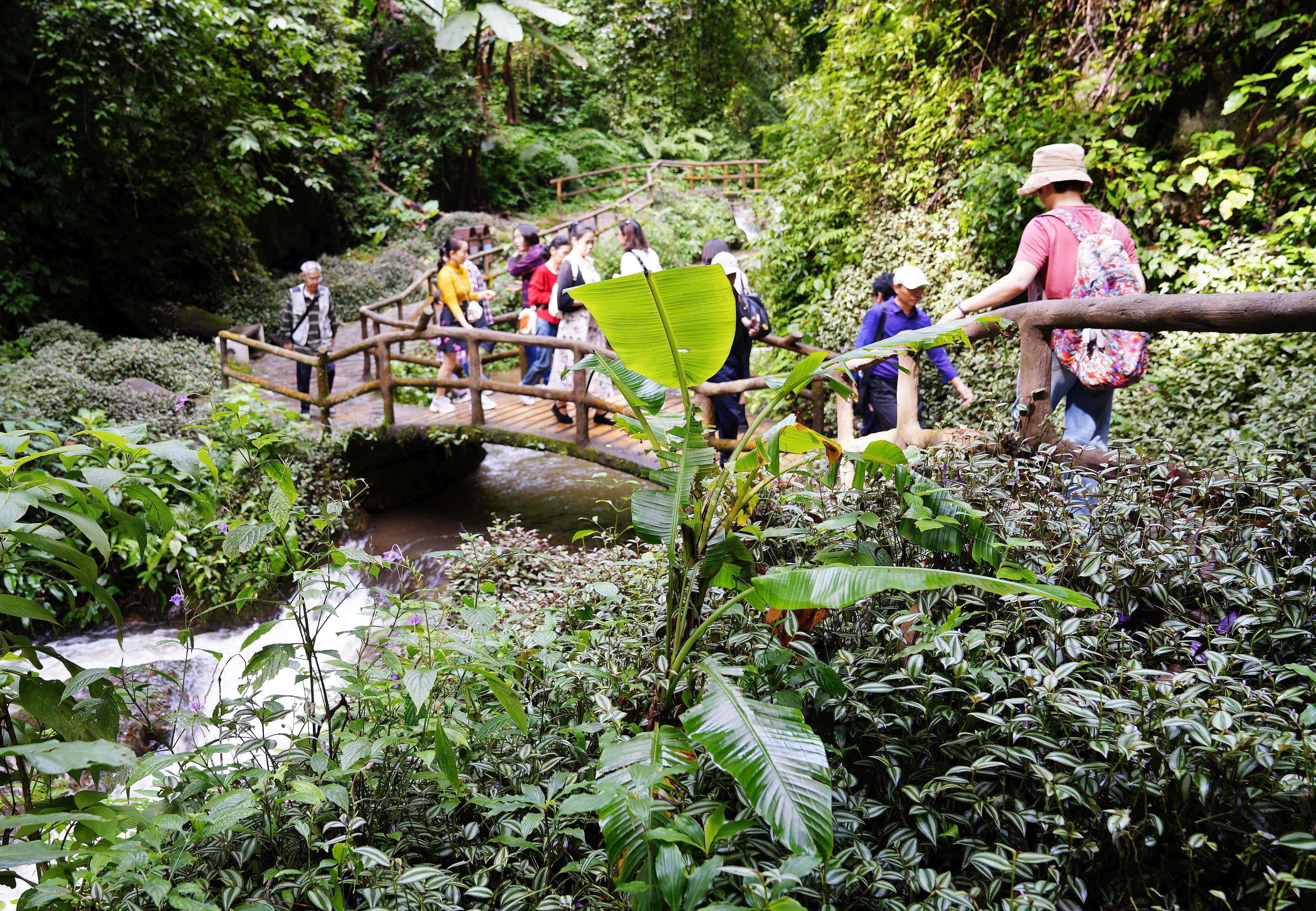 “莫里”在当地傣语中意为“美丽的瀑布”,得名于雨林深处那处震撼人心的壮观景致;它还有个源自巴利语“佛脚印”音译的别称——“扎朵”,暗合园中的佛印仙踪传说。顺着山路前行,沿途的景致皆有故事:灵动的孔雀、奇形怪状的树木、轰鸣的瀑布,还有一路叮咚相伴的溪水,每一处都让人挪不开眼。