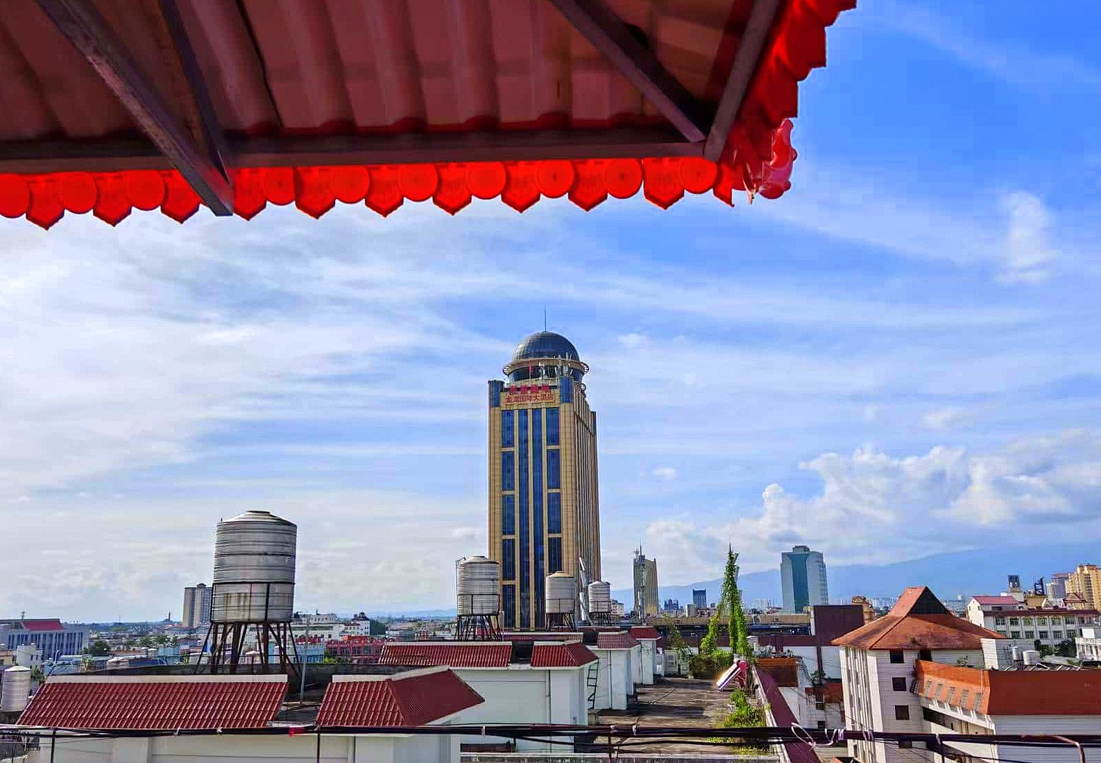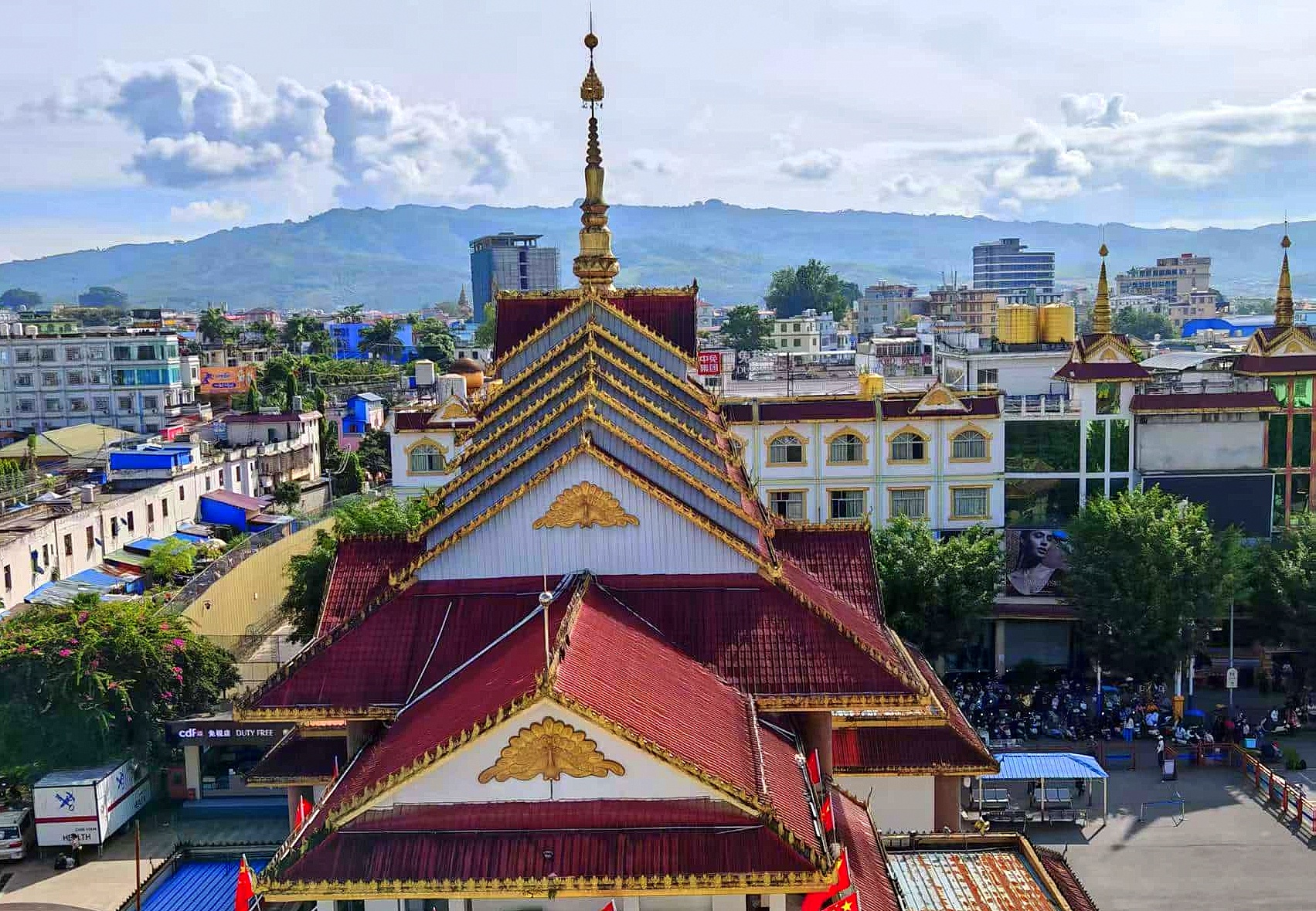 打卡完毕,抬头便能望见旁边建筑楼顶“一眼观两国”的醒目标识牌,这是一处藏在高处的观景天台,也是摄影爱好者的宝藏之地。徒步登上七层高的楼顶,视野瞬间开阔:对面具有浓厚缅甸特色的建筑与田园风光、错落的民居尽收眼底,炊烟袅袅与这边的车水马龙形成奇妙的呼应;低头俯瞰,国门广场上人来人往,若是静下心来,在楼顶的茶桌旁品一杯当地的茶,看两国风光在眼前铺展,时光变得格外舒缓。