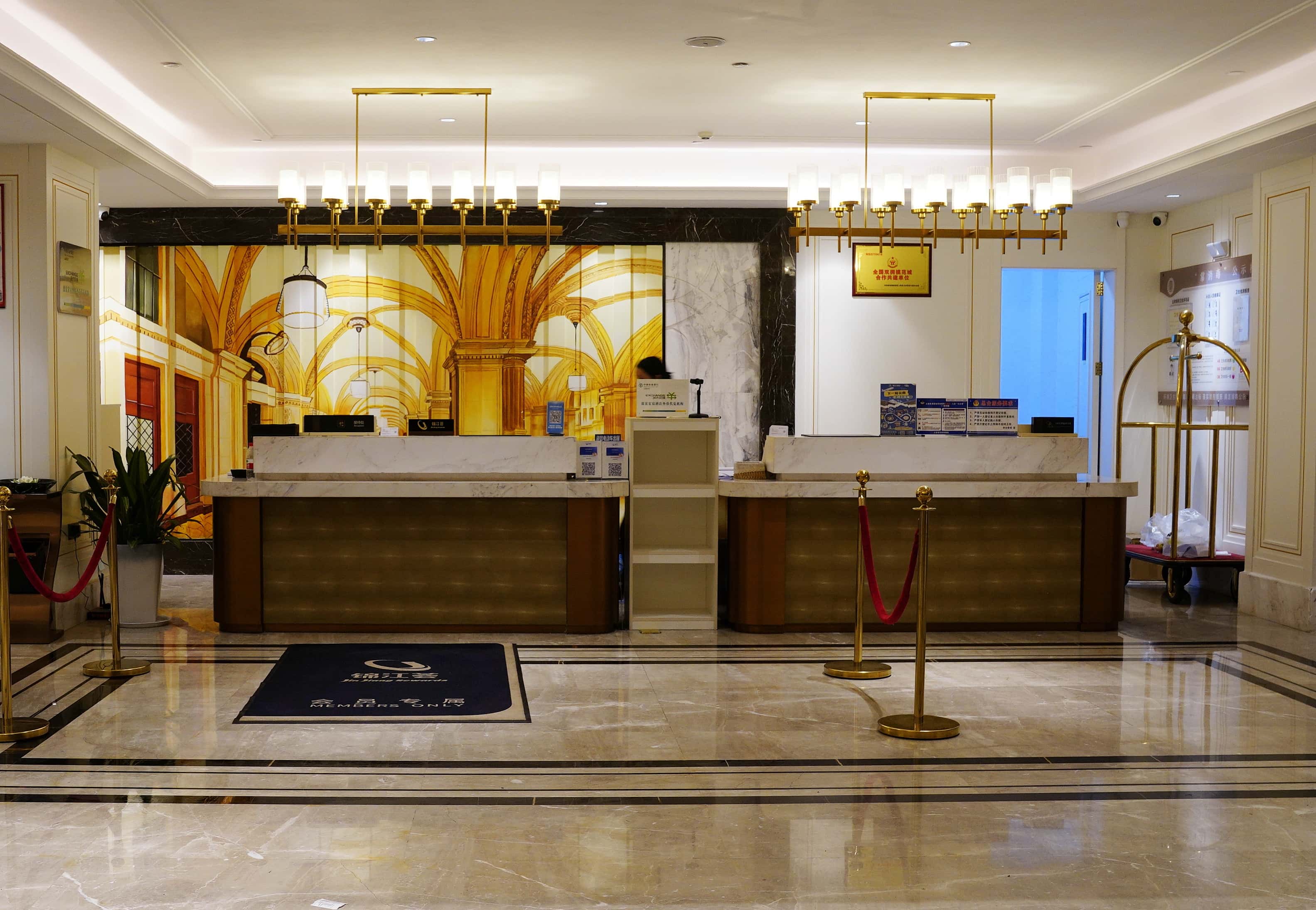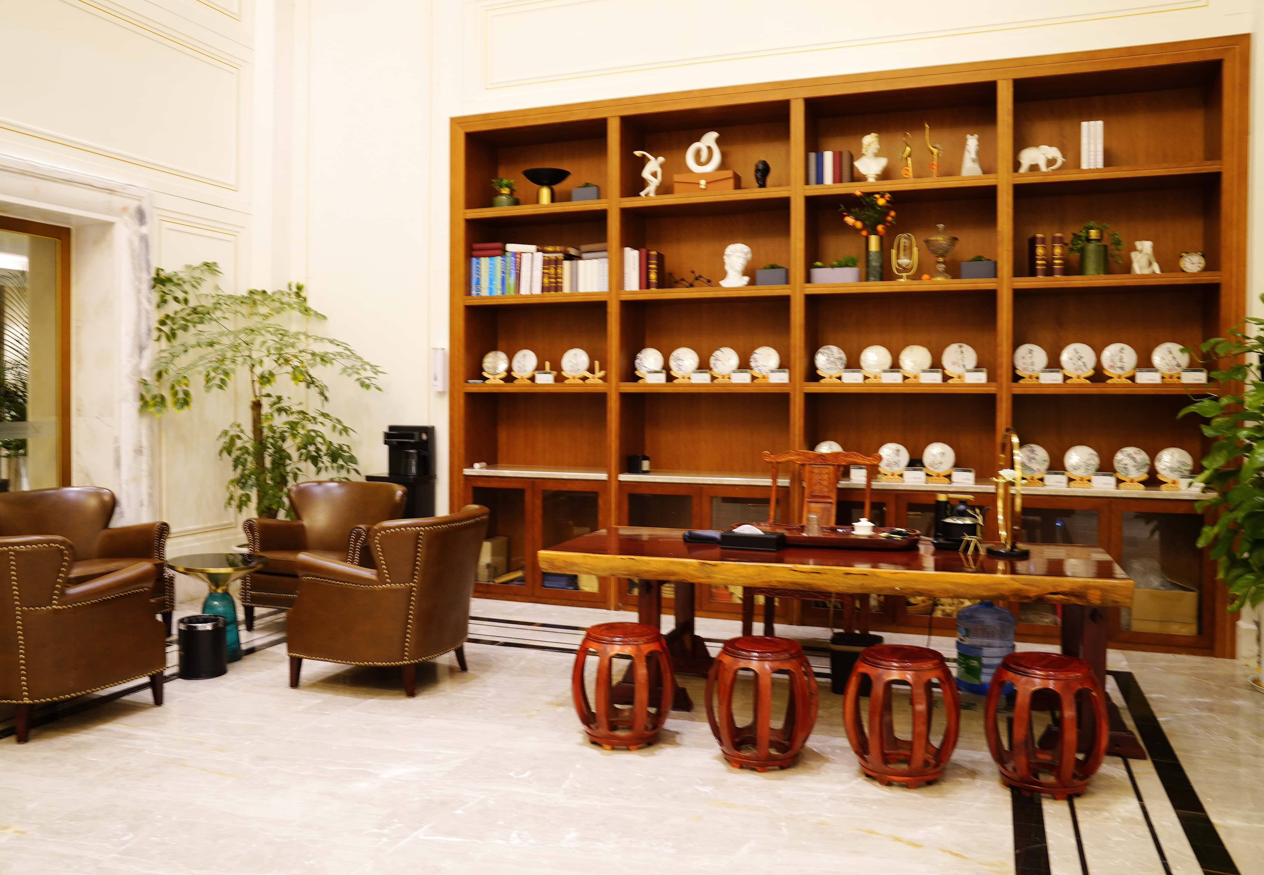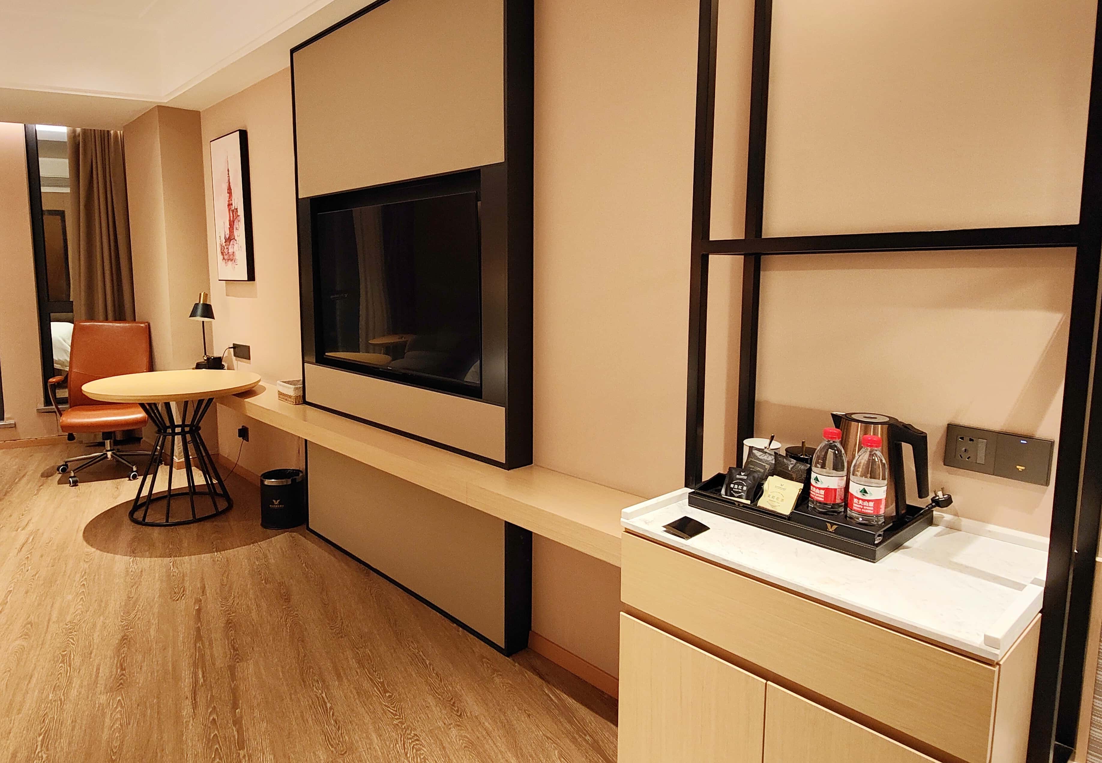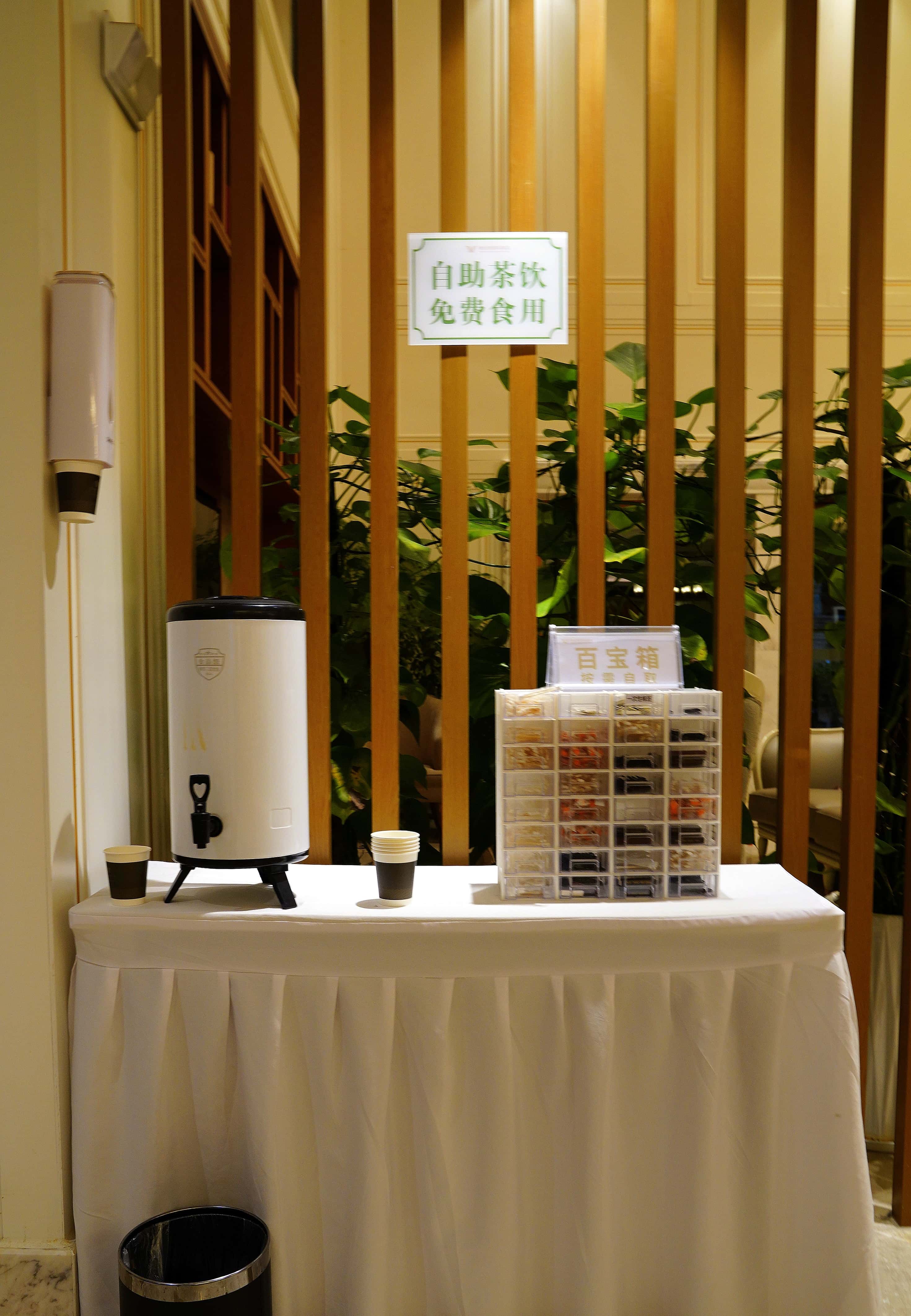 酒店地处闹市区,整座建筑气势恢宏,大堂的富丽堂皇瞬间驱散了旅途疲惫。大理石地面光洁如新,暖黄灯光勾勒出精致的装饰线条,整洁舒适的氛围扑面而来。最让人惊喜的是大堂角落的自助茶饮区,热水、茶叶一应俱全,免费供应的热茶入口温润,瞬间带来家一般的温馨暖意。