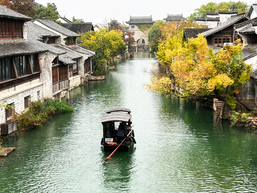 有乌篷船从桥下悠然而过,缓缓行进在秋色里。小舟漾开一圈圈涟漪,岸上的白墙、黛瓦、灯笼、与偶尔探出身子来的绿藤,都在水中颤巍巍地摇晃起来,碎成了一幅流动的、迷离的画。