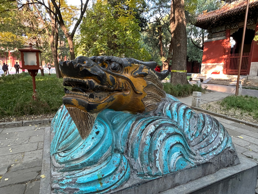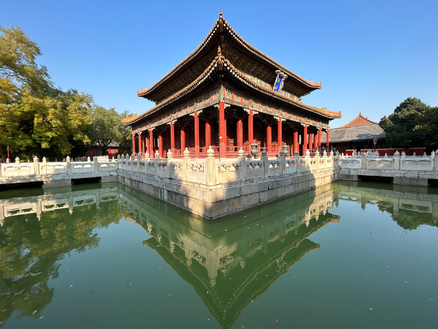 绕到辟雍殿前,一池秋水静得能照见云影。这方曾用于皇帝讲学的辟雍,环水而建,形制独特。想象当年,皇帝端坐殿中,官员与学子跪于殿外,通过传胪官逐层传诵聆听圣训的场景——连听课都如此"费劲",难怪说"必须鸦雀无声,精力集中"。如今池水依旧,只是再不见当年的盛景,唯有几尾锦鲤悠然游弋,搅碎一池秋光。