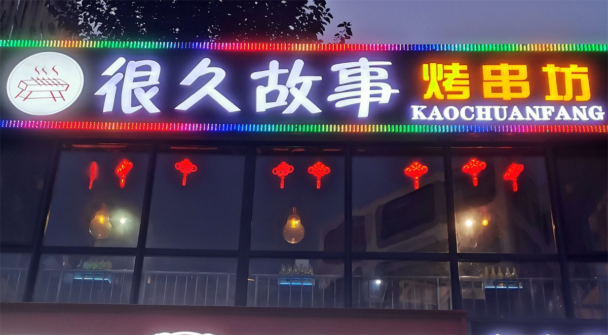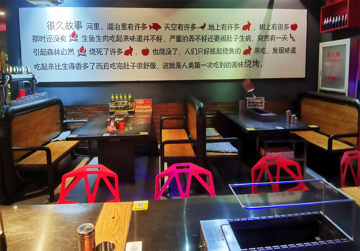 小店主打烤串、烤羊腿与烤海鲜,面积不大却特色十足。霓虹灯光照亮“很久故事烤串坊”的招牌,格外吸引目光。“很久故事”究竟藏着什么?走进店内,墙壁上的内容给出答案,它将过往故事娓娓道来,让人恍然:原来烧烤竟是人类社会起源的重要标志。