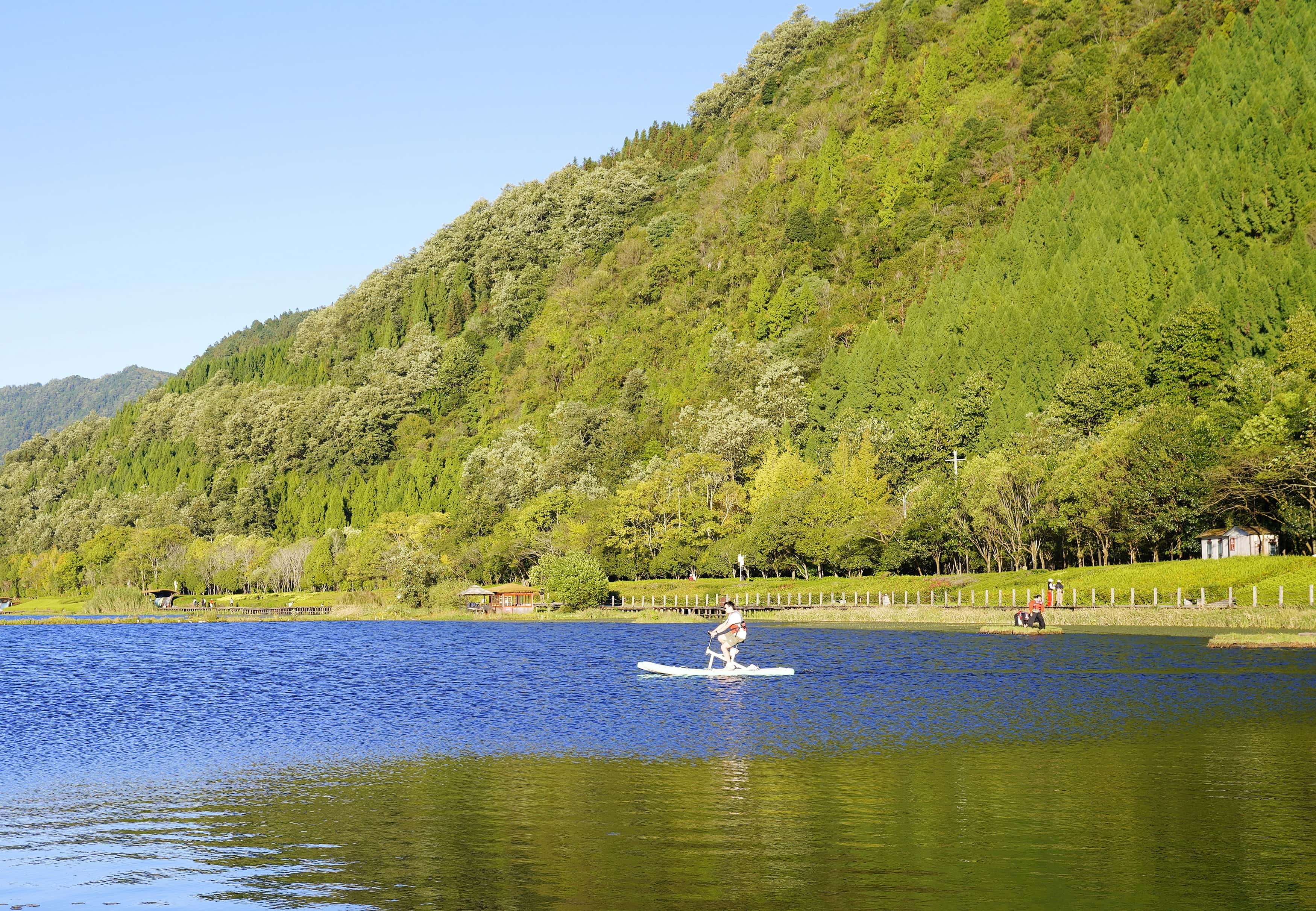 除了赏景,三号渡口的特色项目不容错过。古法罩鱼复刻原著村民的捕鱼智慧;草排体验解锁原生态划水乐趣;还有水上自行车等娱乐项目可供选择。而水上科普长廊的原始竹排栈道,更是挑战胆量的惊喜体验,人行其上晃荡如舟,湖水不时漫过竹排,步步惊心却趣味十足。