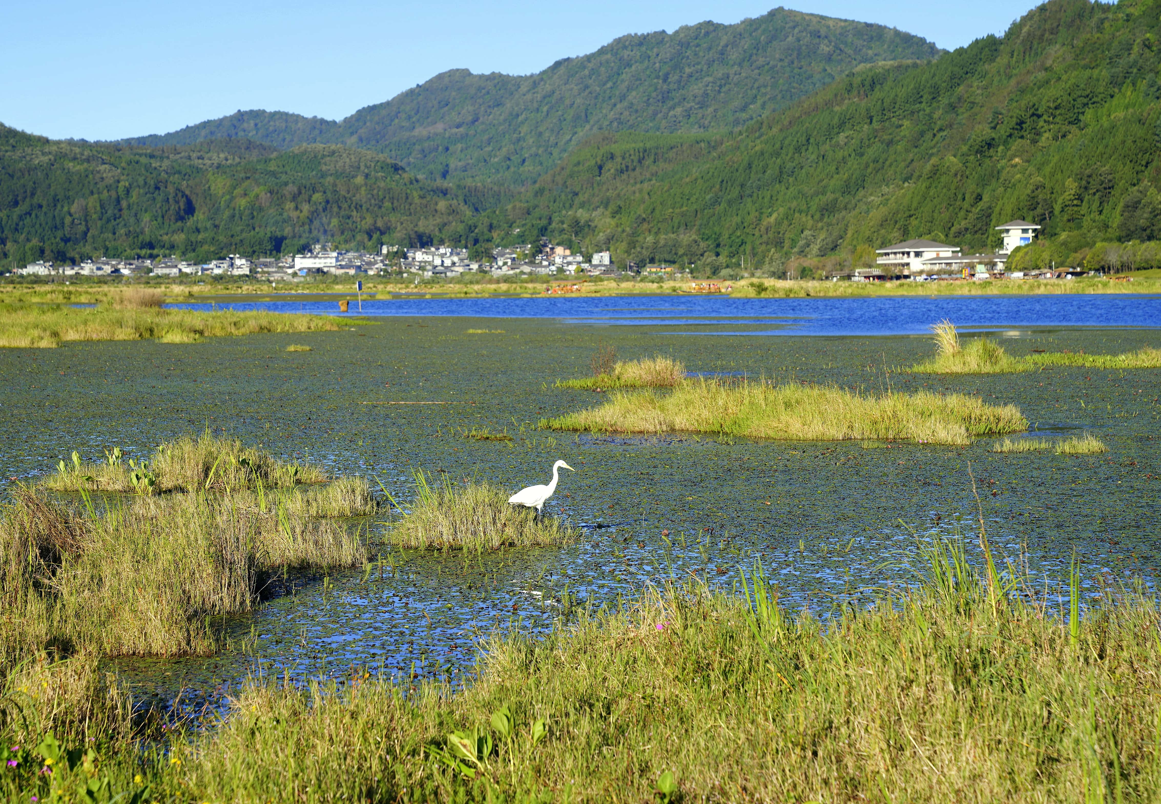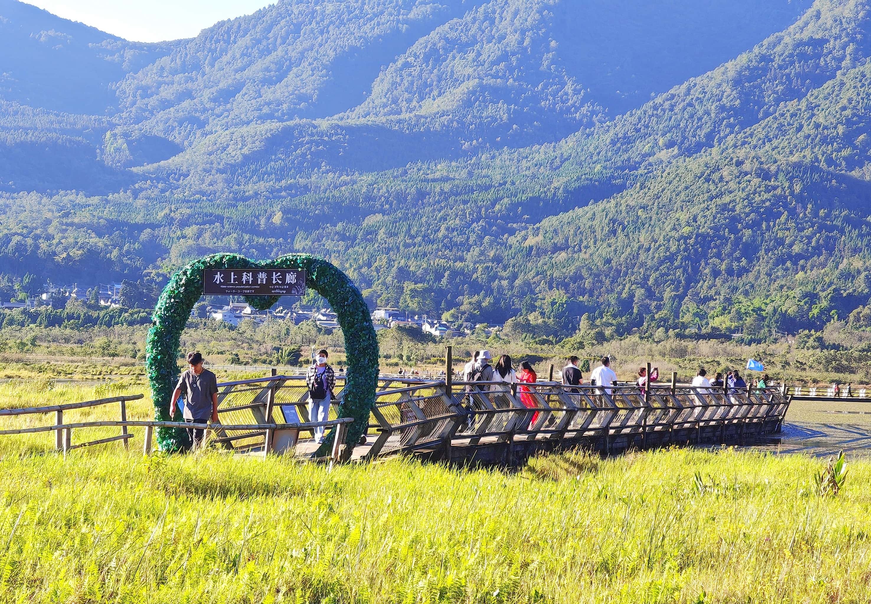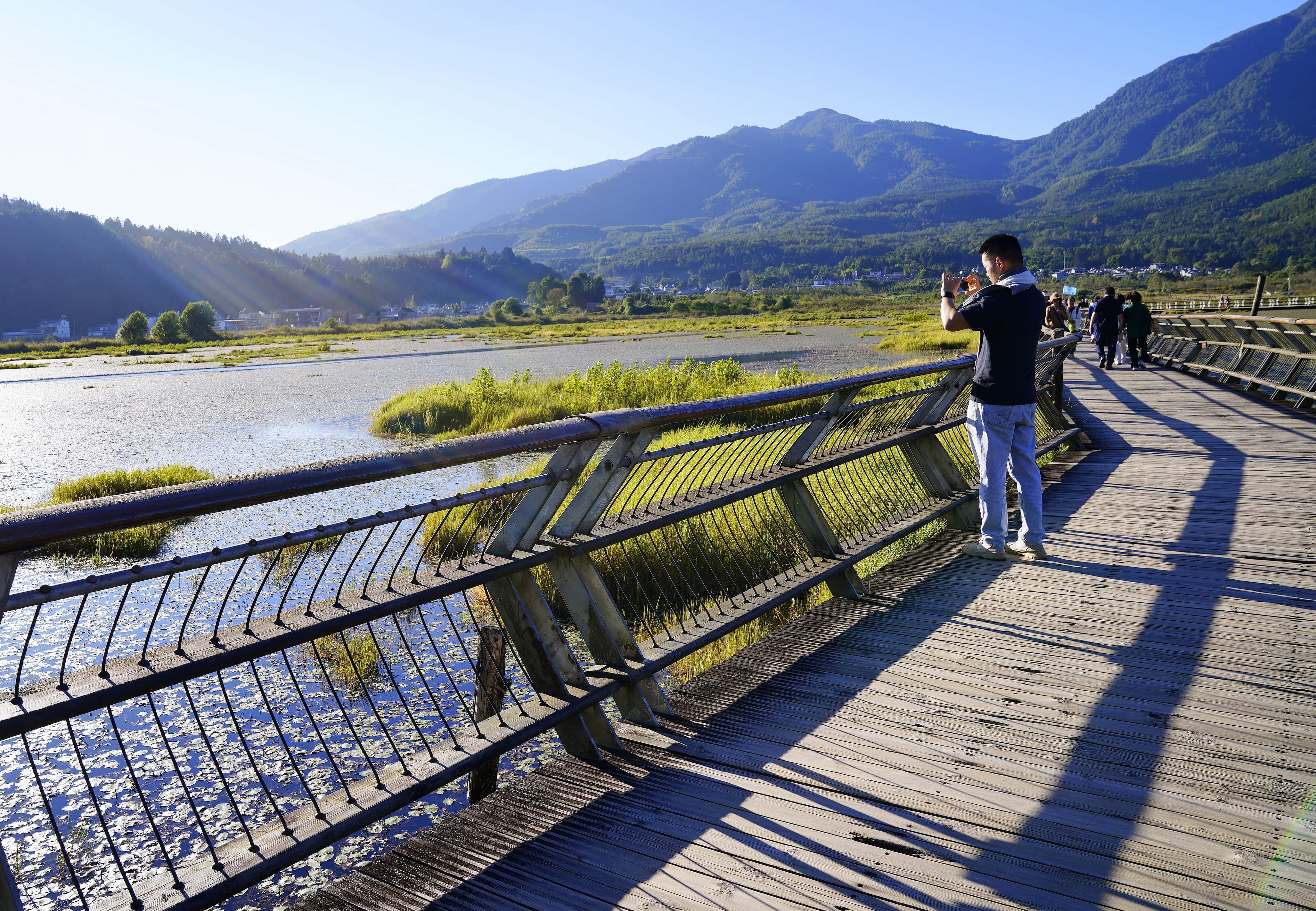 群山环绕的湿地是摄影爱好者的天堂,推荐三处取景地:二、三号渡口岸边,抓拍游船穿梭、罩鱼劳作与草排嬉戏的鲜活场景;水上科普长廊,定格湿地盛景与栖息水禽的自然画卷;二号渡口附近,收录青山映碧水的诗意全景,沿途游客的载歌载舞亦是动人瞬间。