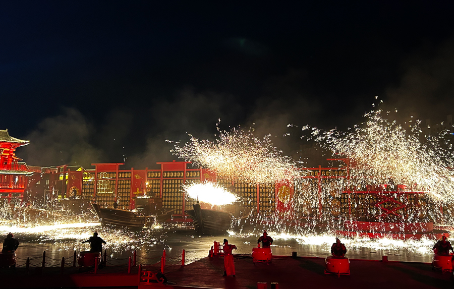 更惊艳的是"凤凰飞天"。唐装舞者被威亚吊起,乘着巨大凤翼凌空起舞,撒下的花瓣在灯光下泛着晶莹光泽。岸上游客纷纷举起手机,却又屏息凝神,生怕惊扰这场穿越千年的瑰丽梦境。