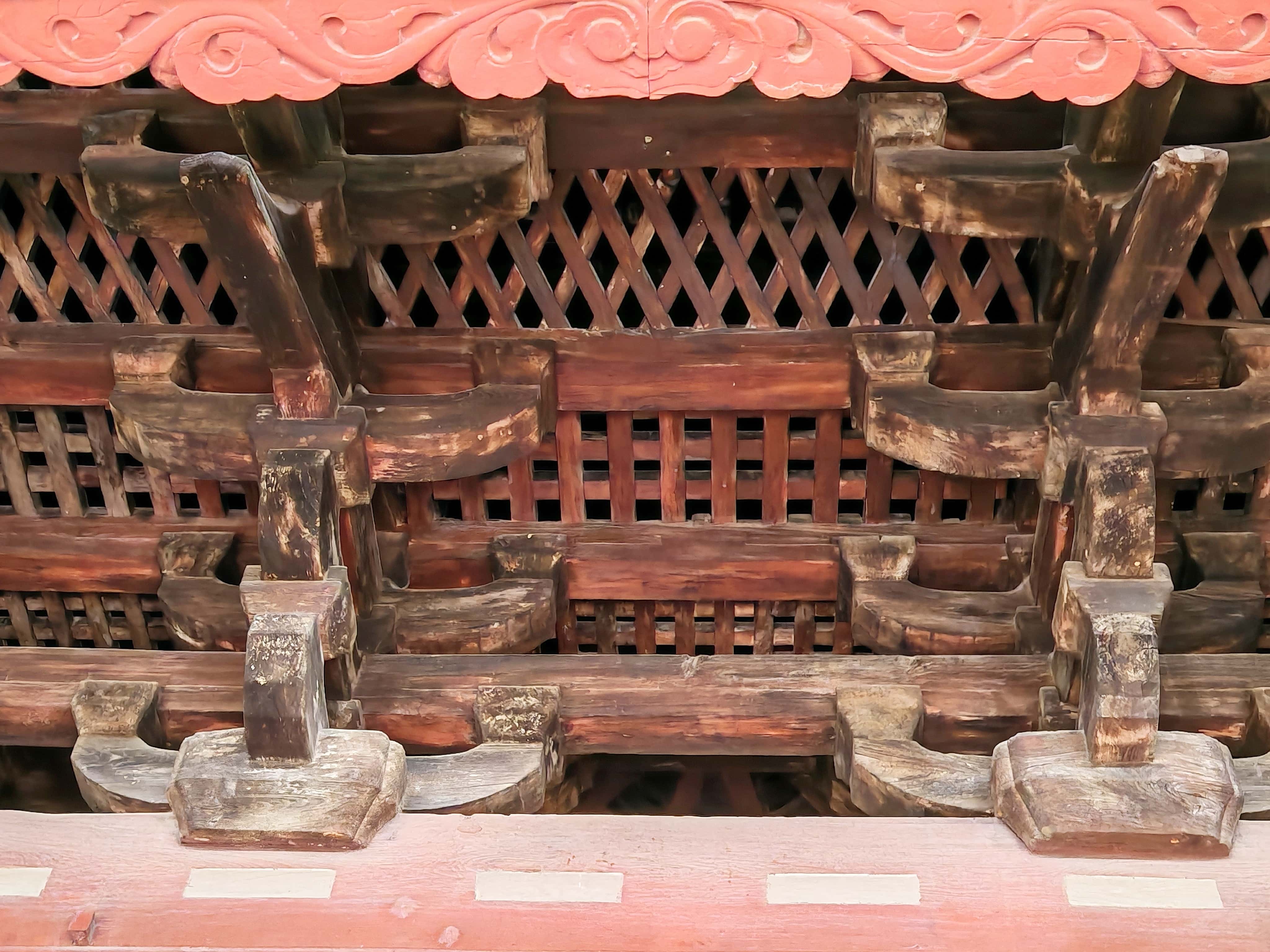 这趟旅程最让我震撼的,莫过于寺中的大雄宝殿,这座江南现存最古老的木构建筑,堪称古人的智慧结晶。驻足细看,精進院上方的藻井精巧绝伦,大殿的斗拱层层叠叠、巧妙衔接,最绝的是全程不用一钉一铆,仅凭精准至极的榫卯技术,就让万千构件牢牢咬合在一起,稳稳承托起厚重的殿顶,指尖轻触木构件,仿佛能触摸到千年之前工匠们的匠心。