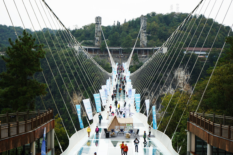 踏上桥面的瞬间,脚下的玻璃传来轻微的震动,像是整座桥在呼吸。我下意识地攥紧扶手,低头望去,透明的玻璃下是深不见底的峡谷,岩石的纹理、溪流的波纹,甚至偶尔掠过的飞鸟,都清晰得触手可及。阳光透过玻璃洒在脚边,将影子拉得很长,仿佛自己也成了峡谷的一部分,与山风、云雾、溪流融为一体。桥的两侧是波浪形的护栏,工作人员说这是为了减少风阻,让桥身在强风中保持稳定。我伸手触摸护栏,金属的冰凉与玻璃的通透形成奇妙的对比,让人不禁感叹设计师的巧思——既保证了安全,又最大程度地保留了“凌空漫步”的震撼体验。