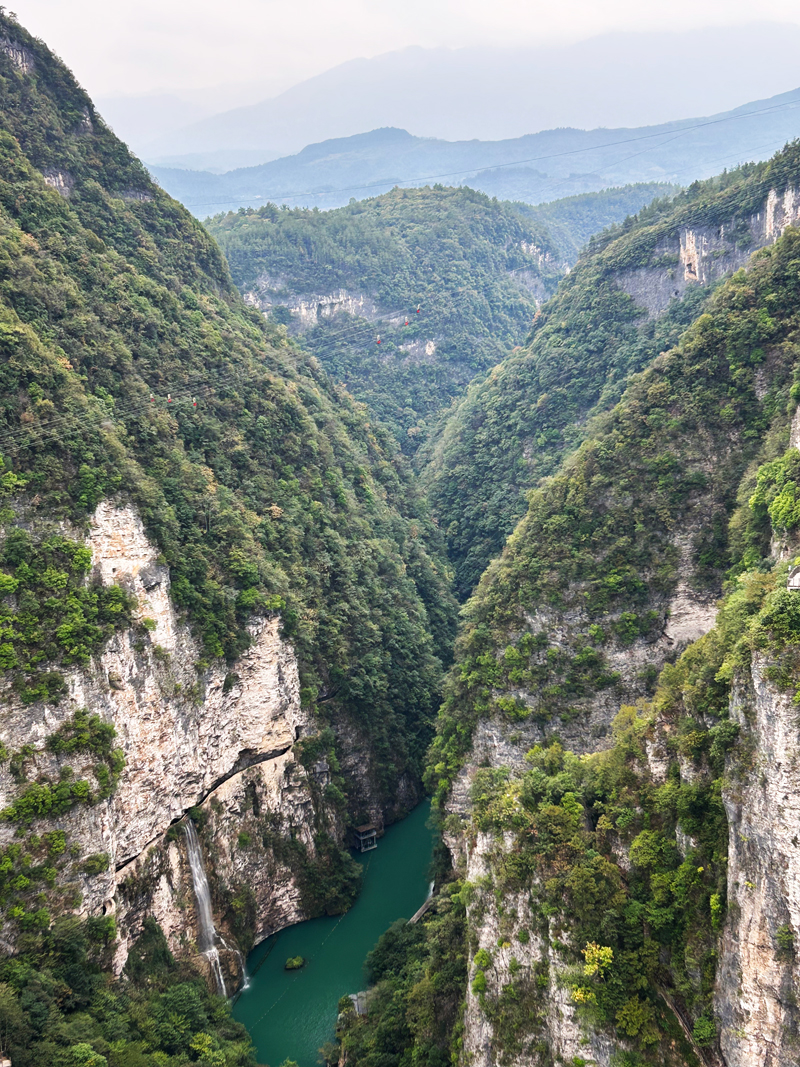 峡谷入口处的人潮像煮沸的水,导游挥舞着小旗,声音被喧嚣吞没。我随着人流挪向峡谷顶端,脚下是近两千级石阶,像一条垂落的灰色绸带,蜿蜒着没入深谷。扶着冰凉的栏杆往下走,两侧崖壁如刀削般笔直,抬头只能看见一线被切割得狭长的天空,阳光从缝隙里漏下来,在石阶上投下细碎的光斑。同行的阿姨们叽叽喳喳地拍照,我却只听见自己粗重的呼吸,和心跳撞击耳膜的声响。这哪里是下山,分明是一场与自己的较劲。