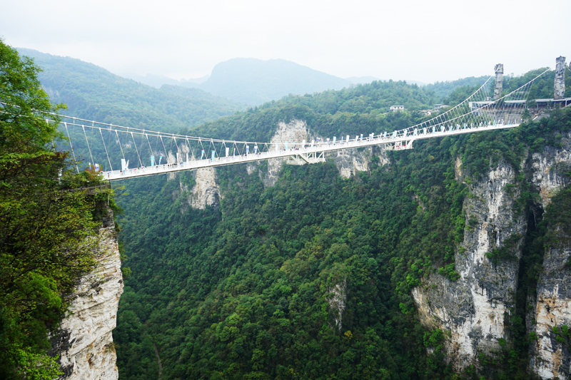 两座巍峨的山峰之间,一道纤细的银线横跨天际,仿佛仙人遗落的玉带,又似云端垂下的天梯——那便是闻名遐迩的云天渡玻璃桥。