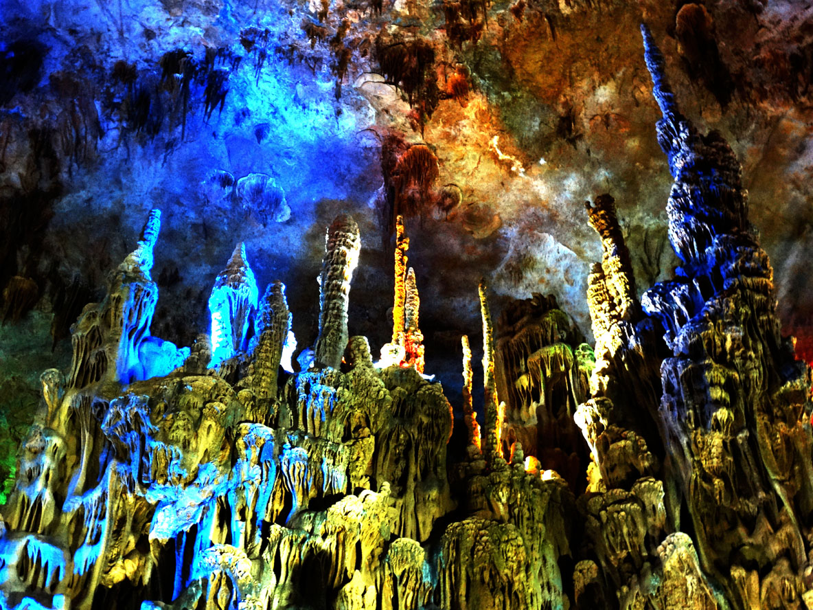 在一处宽阔处环视四周,这里俨然就是一个晶莹剔透的世界,一个无比宽敞的艺术迷宫,一个四通八达金碧辉煌的殿堂,顶部倒挂着的水晶钟乳石,如宫灯五彩缤纷,如宝剑寒光四射,如神塔银光闪闪,如彩虹飞架苍空,如北斗众星拱月,如牛郞织女鹊桥相会,如齐天大圣云端翻腾,这石林胜境奇幻且真实。