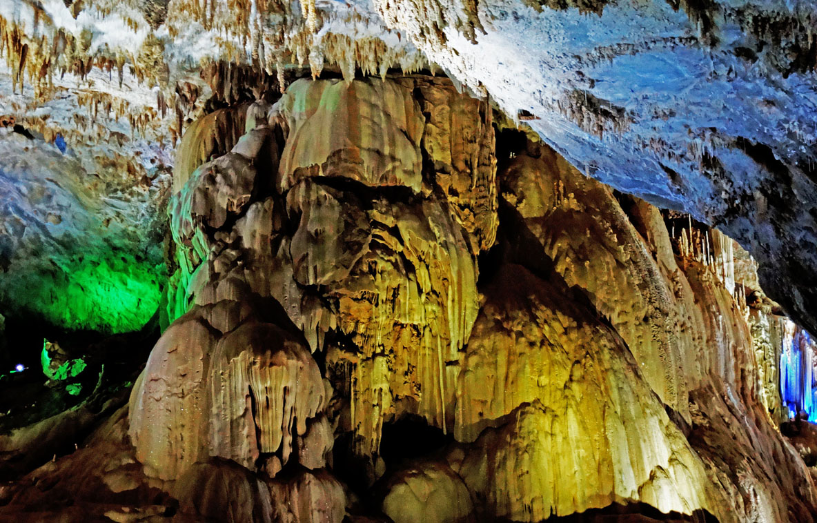 然而,事实貌似不是这样,检索资料发现,这河大海没有半毛钱关系,资料显示,这里的喀斯特地貌属于峰丛洼地中的大型岩溶洞穴,形成的原因是地下河的侵蚀、溶蚀、崩塌,经过雨水中的碳酸溶解石灰岩并产生反应,从而结晶,然后经过上百万年的光阴沉淀、发育、生长,成为今天我们看到的模样。