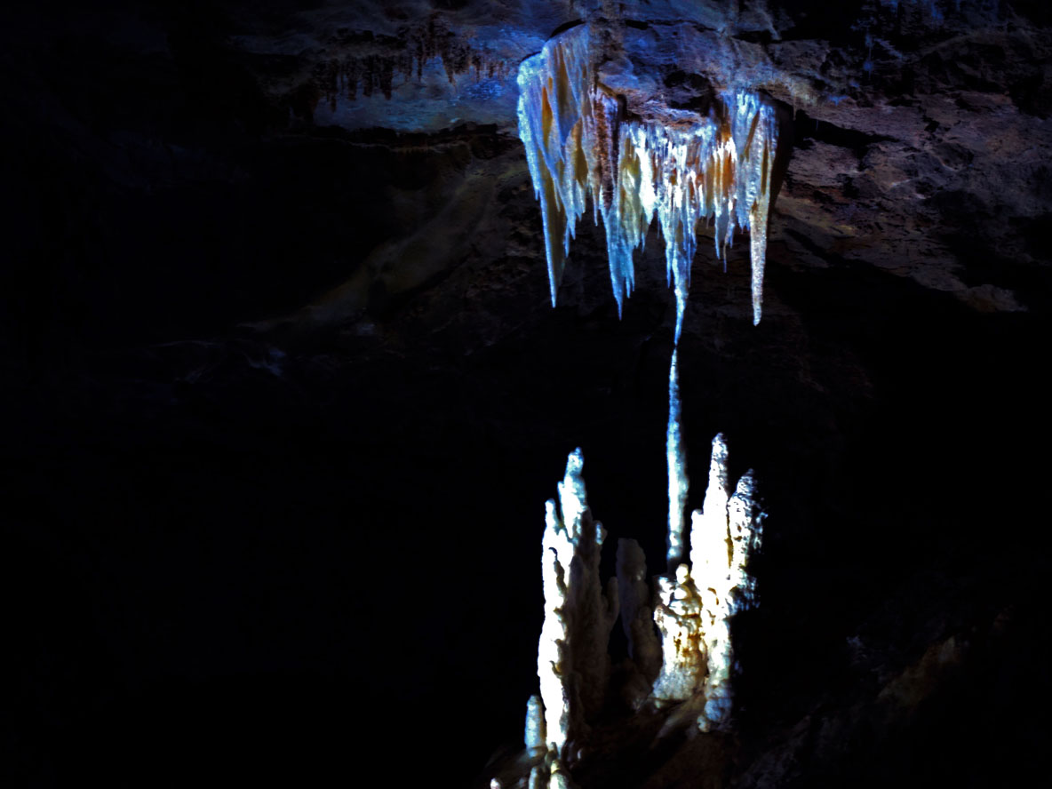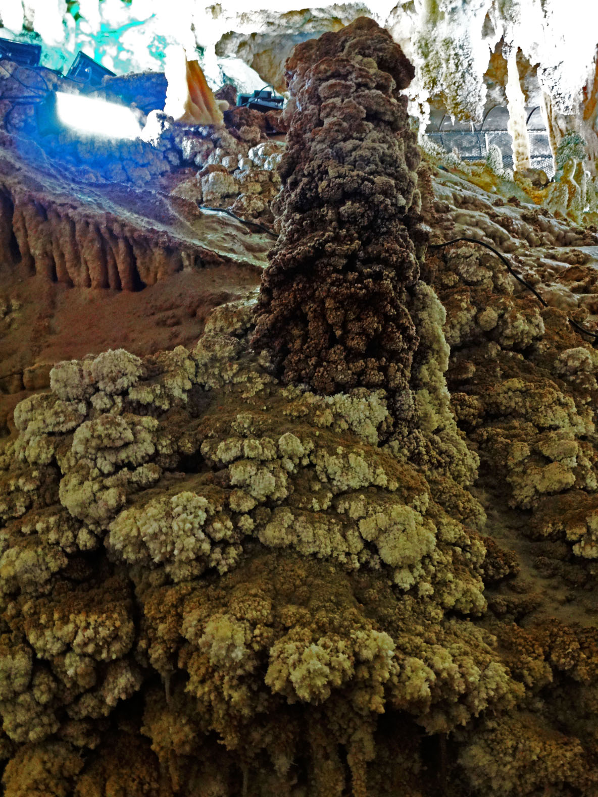 沿着观景栈道前行,借着不算太暗的灯光,你会看到脚下两边散落的类似散土碎石的东西,这些看似散落的土石,其实也是与这融为一体的,它们附着在大地,不可分离,和眼前的钟乳石一样,已成晶块,只是颜色不同。
